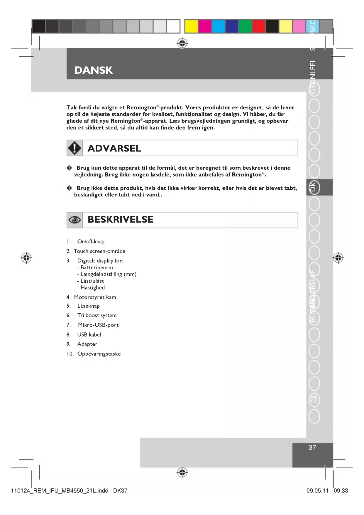 Brug ikke dette produkt, hvis det ikke virker korrekt, eller hvis det er blevet tabt, beskadiget eller tabt ned i vand.. BESKRIVELSE 1. On/off-knap2. Touch screen-område3. Digitalt display for:- Batteriniveau- Længdeindstilling (mm)- Låst/ulåst- Hastighed4. Motorstyret kam5. Låseknap6. Tri boost system7. Mikro-USB-port8. USB kabel9. Adapter10. Opbevaringstaske110124_REM_IFU_MB4550_21L.indd DK37 09.05.11 09:33DANSK