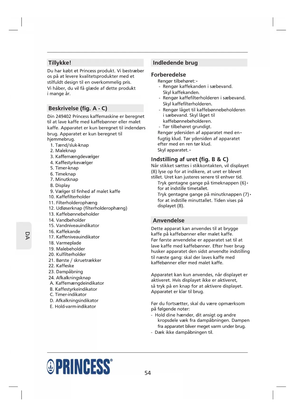 Tillykke! Du har købt et Princess produkt. Vi bestræber os på at levere kvalitetsprodukter med et stilfuldt design til en overkommelig pris. Vi håber, du vil få glæde af dette produkt i mange år. Beskrivelse (fig. A - C) Din 249402 Princess kaffemaskine er beregnet til at lave kaffe med kaffebønner eller malet kaffe. Apparatet er kun beregnet til indendørs brug. Apparatet er kun beregnet til hjemmebrug.