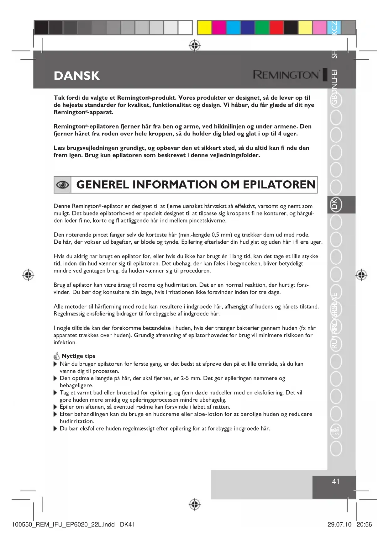 Når du bruger epilatoren for første gang, er det bedst at afprøve den på et lille område, så du kan vænne dig til processen. Den optimale længde på hår, der skal fjernes, er 2-5 mm. Det gør epileringen nemmere og behageligere. Tag et varmt bad eller brusebad før epilering, og fjern døde hudceller med en eksfoliering. Det vil gøre huden mere smidig og epileringsprocessen mindre ubehagelig. Epiler om aftenen, så eventuel rødme kan forsvinde i løbet af natten. Efter behandlingen kan du bruge en hudcreme eller aloe-lotion for at berolige huden og reducere hudirritation. Du bør eksfoliere huden regelmæssigt efter epilering for at forebygge indgroede hår. DANSK 100550_REM_IFU_EP6020_22L.indd DK41100550_REM_IFU_EP6020_22L.indd DK41 29.07.10 20:5629.07.10 20:56DANSK