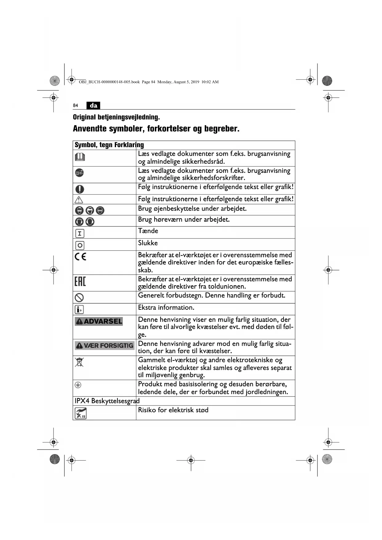 Original betjeningsvejledning. Anvendte symboler, forkortelser og begreber. Symbol, tegn Forklaring Læs vedlagte dokumenter som f.eks. brugsanvisning og almindelige sikkerhedsråd. Læs vedlagte dokumenter som f.eks. brugsanvisning og almindelige sikkerhedsforskrifter. Følg instruktionerne i efterfølgende tekst eller grafik! Følg instruktionerne i efterfølgende tekst eller grafik! Brug øjenbeskyttelse under arbejdet. Brug høreværn under arbejdet. Tænde Slukke Bekræfter at el-værktøjet er i overensstemmelse med gældende direktiver inden for det europæiske fælles- skab. Bekræfter at el-værktøjet er i overensstemmelse med gældende direktiver fra toldunionen. Generelt forbudstegn. Denne handling er forbudt. Ekstra information. Denne henvisning viser en mulig farlig situation, der kan føre til alvorlige kvæstelser evt. med døden til føl- ge. Denne henvisning advarer mod en mulig farlig situa- tion, der kan føre til kvæstelser. Gammelt el-værktøj og andre elektrotekniske og elektriske produkter skal samles og afleveres separat til miljøvenlig genbrug. Produkt med basisisolering og desuden berørbare, ledende dele, der er forbundet med jordledningen. IPX4 Beskyttelsesgrad Risiko for elektrisk stød OBJ_BUCH-0000000148-005.book Page 84 Monday, August 5, 2019 10:02 AM85