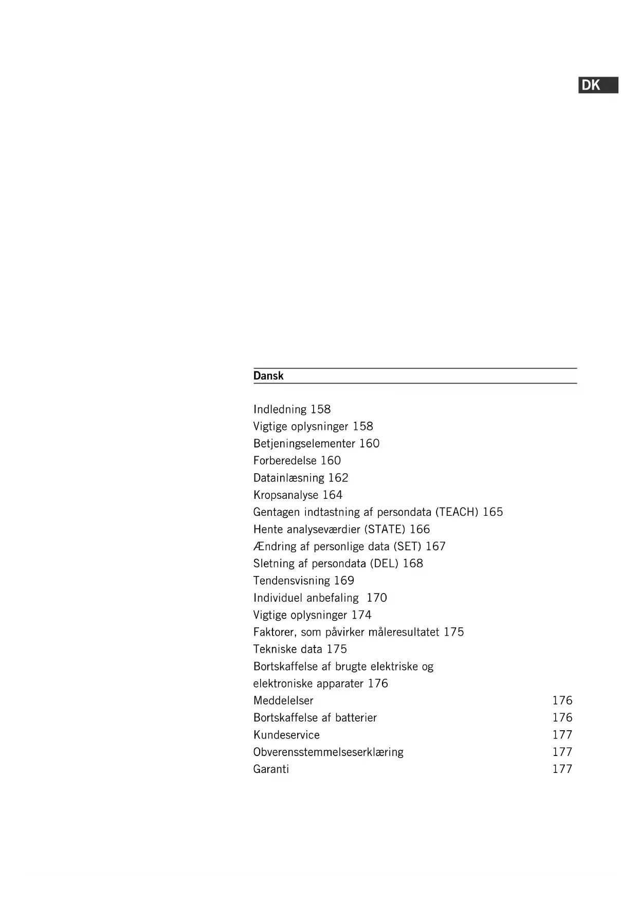vægten eller fødderne, eller sørg for, at huden er tilstrækkelig fugtig. Er huden for tør – fugt fød- derne, eller foretag målin- gen, efter at du har været i bad. Bortskaffelse af batterier Batterier må ikke smides ud som almindeligt hushold- ningsaffald. Som forbruger er du lovmæssigt forpligtet til at indlevere brugte batterier på rette sted. Brugte batterier kan indleveres på offentlige affaldsdepoter i din kommune eller på de steder, hvor der forhandles batterier af pågældende type. Pb = indeholder bly Cd = indeholder cadmium Hg = indeholder kviksølv Bortskaffelse af brugte elektriske og elektronis- ke apparater Symbolet på pro- duktet eller emballagen indi- kerer, at dette pro- dukt ikke skal behandles som almindeligt husholdningsaf- fald, men skal indleveres på genbrugsstation el. lign., hvor elektriske og elektroniske apparater modtages til affaldssortering og genanven- delse. Du kan få yderligere information hos din kommu- ne, nærmeste genbrugsstation eller hos den forhandler, hvor du købte produktet.