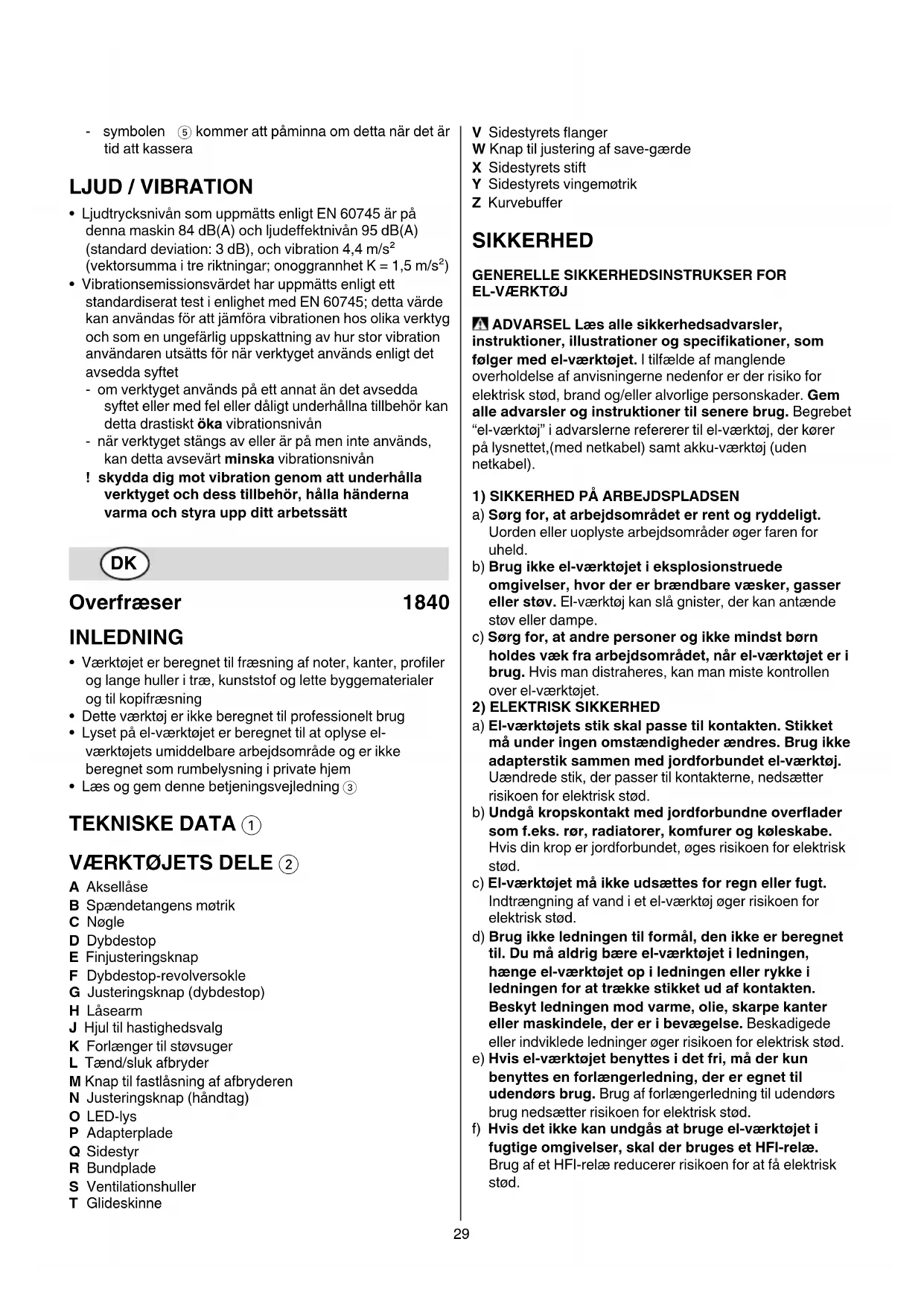 A Aksellåse B Spændetangens møtrik C Nøgle D Dybdestop E Finjusteringsknap F Dybdestop-revolversokle G Justeringsknap (dybdestop) H Låsearm J Hjul til hastighedsvalg K Forlænger til støvsuger L Tænd/sluk afbryder M Knap til fastlåsning af afbryderen N Justeringsknap (håndtag) O LED-lys P Adapterplade Q Sidestyr R Bundplade S Ventilationshuller T Glideskinne V Sidestyrets anger W Knap til justering af save-gærde X Sidestyrets stift Y Sidestyrets vingemøtrik Z Kurvebuer SIKKERHED