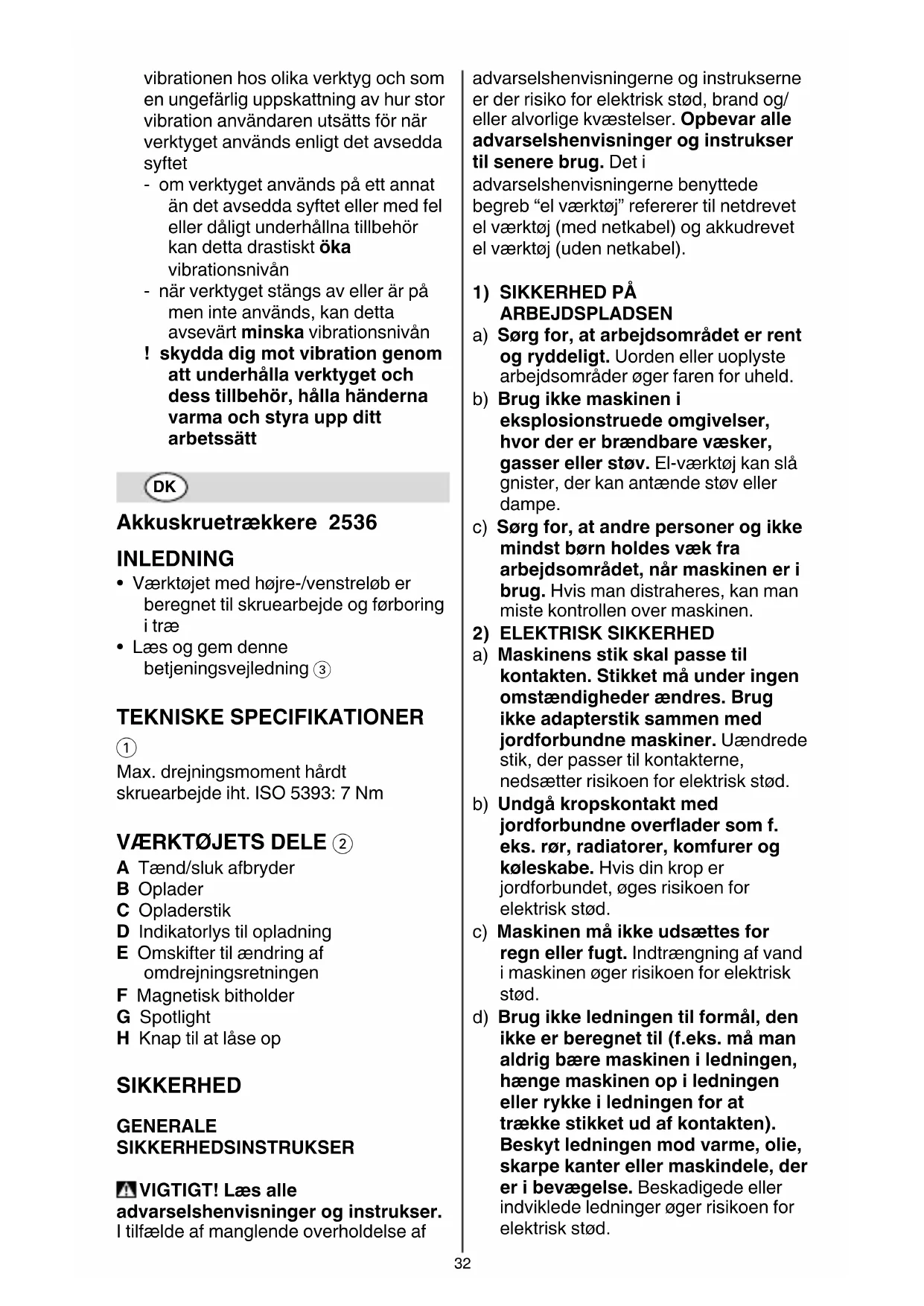 A Tænd/sluk afbryder B Oplader C Opladerstik D Indikatorlys til opladning E Omskifter til ændring af omdrejningsretningen F Magnetisk bitholder G Spotlight H Knap til at låse op SIKKERHED GENERALE SIKKERHEDSINSTRUKSER VIGTIGT! Læs alle advarselshenvisninger og instrukser. I tilfælde af manglende overholdelse af advarselshenvisningerne og instrukserne er der risiko for elektrisk stød, brand og/ eller alvorlige kvæstelser. Opbevar alle advarselshenvisninger og instrukser til senere brug. Det i advarselshenvisningerne benyttede begreb “el værktøj” refererer til netdrevet el værktøj (med netkabel) og akkudrevet el værktøj (uden netkabel).