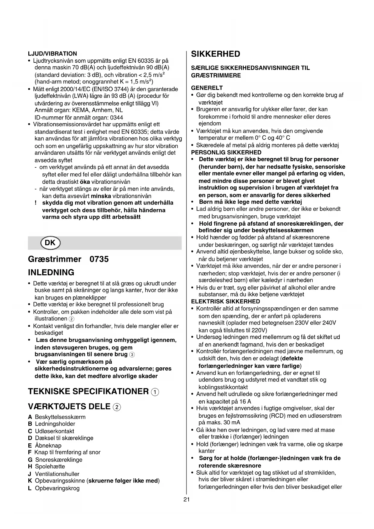 A Beskyttelsesskærm B Ledningsholder C Udløserkontakt D Dæksel til skæreklinge E Åbneknap F Knap til fremføring af snor G Snoreskæreklinge H Spolehætte J Ventilationshuller K Opbevaringsskinne (skruernefølgerikkemed) L Opbevaringskrog SIKKERHED