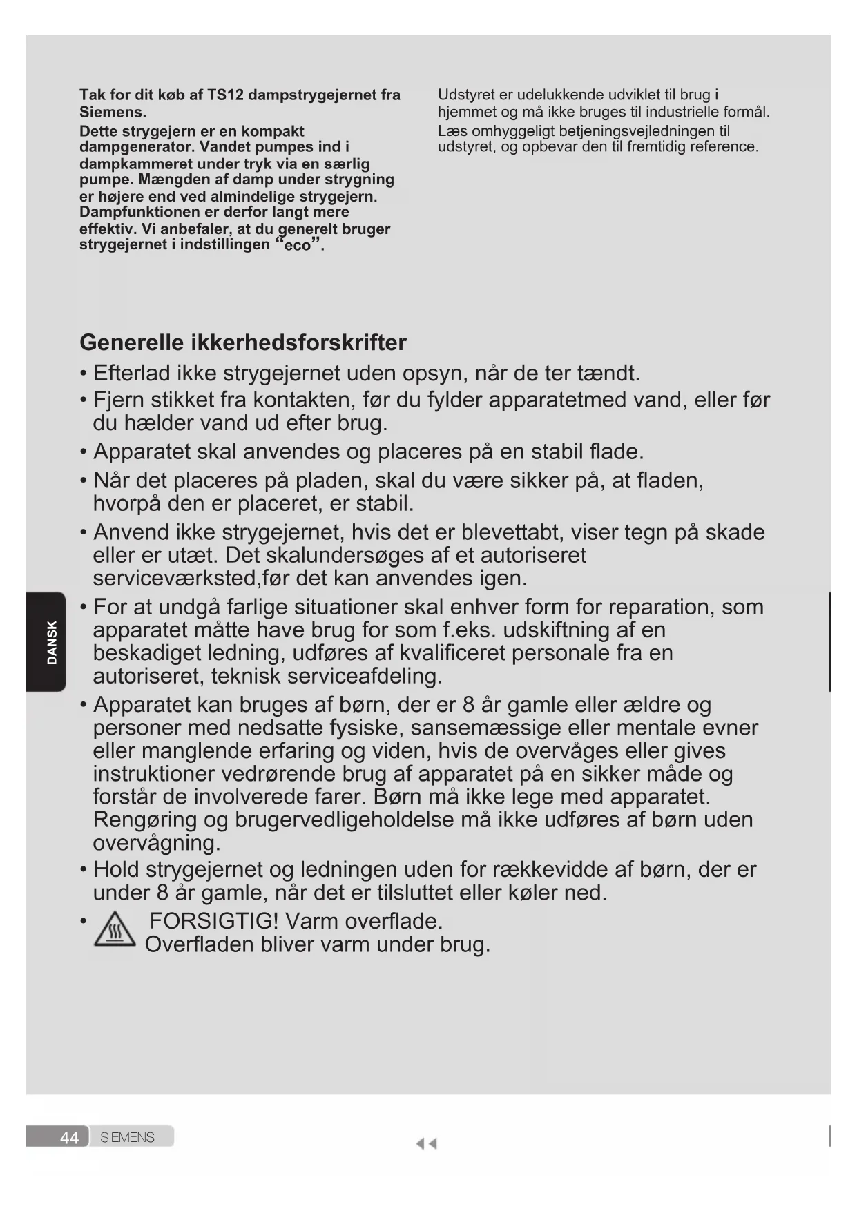 servicecentrum.44 S I E M E N SDANSK Tak for dit køb af TS12 dampstrygejernet fra