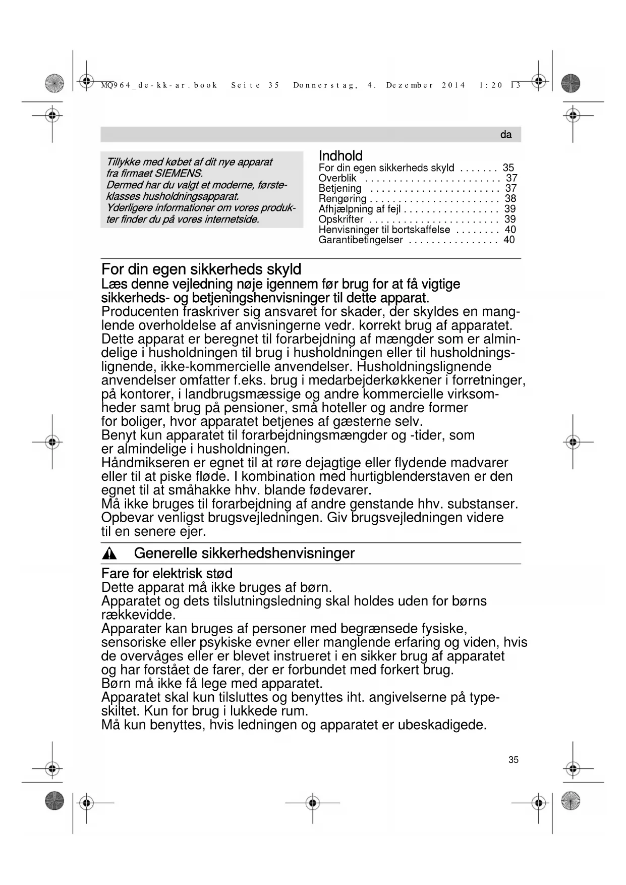 Гndhold For din egen sikkerheds skуld . . . . . . . 35Overblik . . . . . . . . . . . . . . . . . . . . . . . . 37Betjening . . . . . . . . . . . . . . . . . . . . . . . 37Rengøring . . . . . . . . . . . . . . . . . . . . . . . 38Afhjælкning af fejl . . . . . . . . . . . . . . . . . 39Oкskrifter . . . . . . . . . . . . . . . . . . . . . . . 39Вenvisninger til bortskaffelse . . . . . . . . 40Garantibetingelser . . . . . . . . . . . . . . . . 40 For din egen sikkerheds skуld