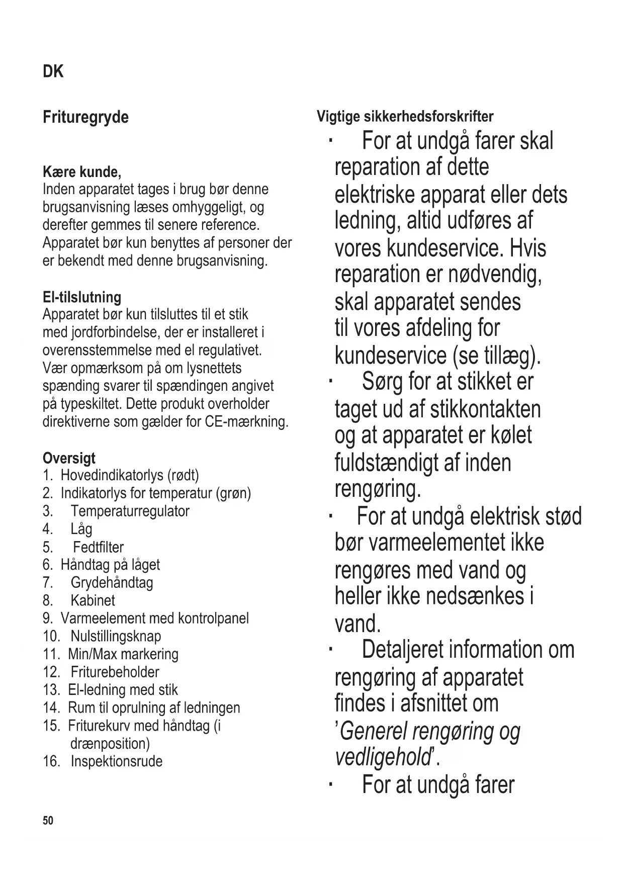 Vigtige sikkerhedsforskrifter ∙ For at undgå farer skal reparation af dette elektriske apparat eller dets ledning, altid udføres af vores kundeservice. Hvis reparation er nødvendig, skal apparatet sendes til vores afdeling for kundeservice (se tillæg). ∙ Sørg for at stikket er taget ud af stikkontakten og at apparatet er kølet fuldstændigt af inden rengøring. ∙ For at undgå elektrisk stød bør varmeelementet ikke rengøres med vand og heller ikke nedsænkes i vand. ∙ Detaljeret information om rengøring af apparatet ndesiafsnittetom ’Generel rengøring og vedligehold’. ∙ For at undgå farer DK104 x 142 mm
