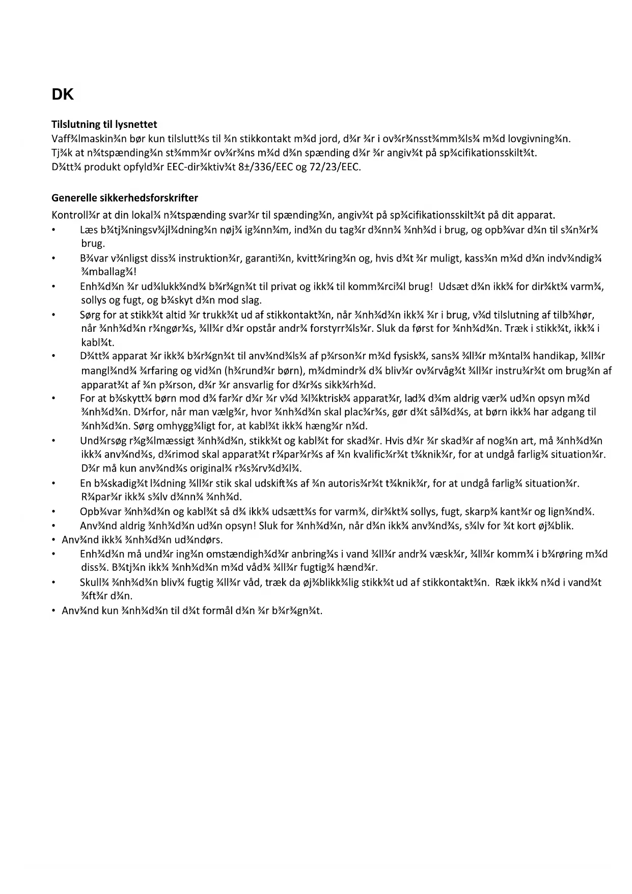 Garanti ^3/4 n dækk ^3/4 r naturligvis ikk ^3/4 almind ^3/4 ligt slidtag ^3/4 , h ^3/4 ll ^3/4 r ikk ^3/4 skrøb ^3/4 lig ^3/4 ting som k ^3/4 ramisk ^3/4 d ^3/4 l ^3/4 , pær ^3/4 r ^3/4 tc. Hvis apparat ^3/4 t f ^3/4 jl ^3/4 r og skal r ^3/4 turn ^3/4 r ^3/4 s, pak d ^3/4 t omhygg ^3/4 ligt, v ^3/4 dlæg ^3/4 n s ^3/4 dd ^3/4 l m ^3/4 d navn og adr ^3/4 ss ^3/4 og årsag ^3/4 n for r ^3/4 turn ^3/4 ring, og bring d ^3/4 t tilbag ^3/4 til købsadr ^3/4 ss ^3/4 n. Hvis d ^3/4 t ^3/4 r ind ^3/4 n for garantip ^3/4 riod ^3/4 n så v ^3/4 dlæg lig ^3/4 l ^3/4 d ^3/4 s garantib ^3/4 vis ^3/4 t samt kvitt ^3/4 ring ^3/4 n.