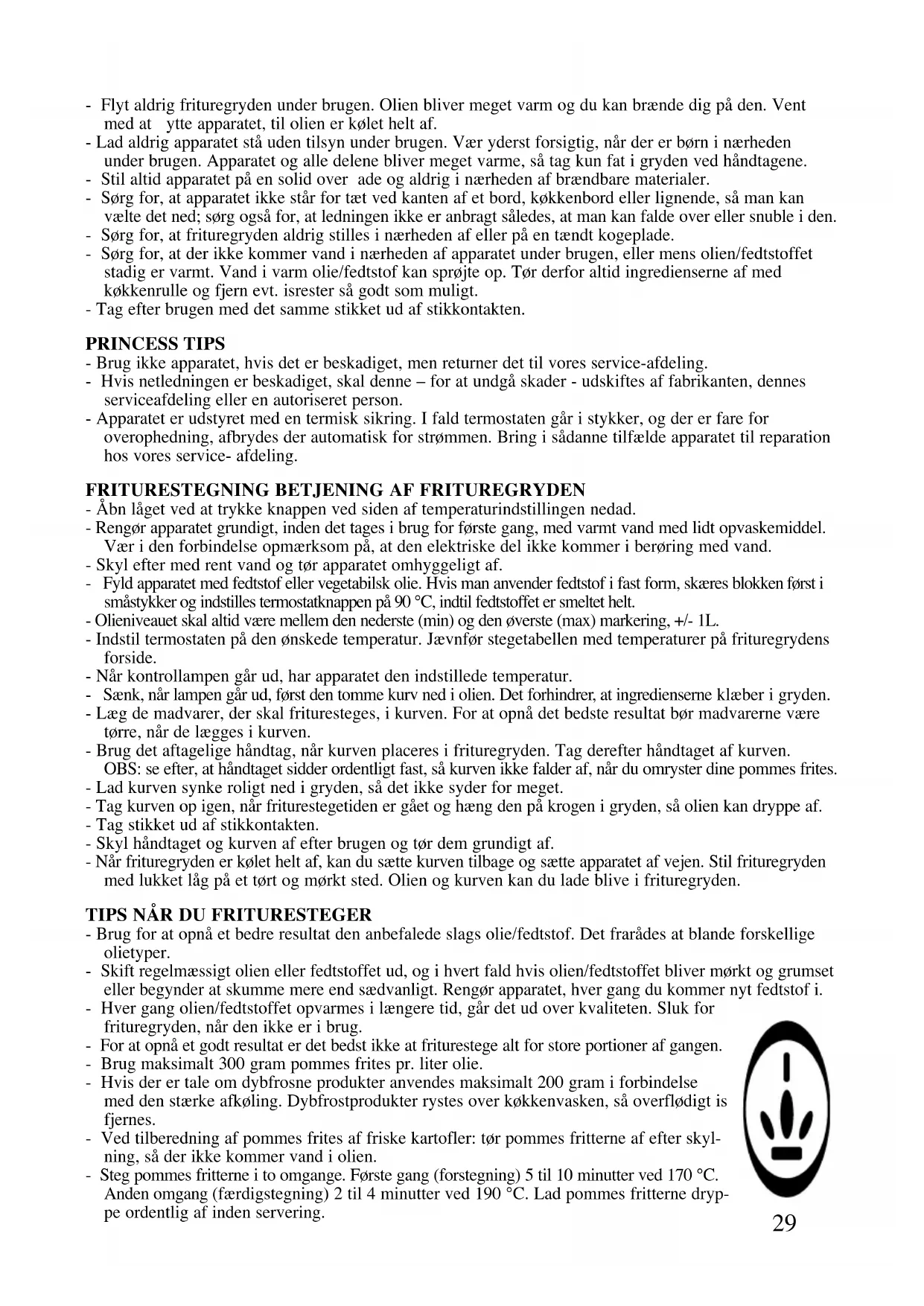 - Flyt aldrig frituregryden under brugen. Olien bliver meget varm og du kan brænde dig på den. Vent