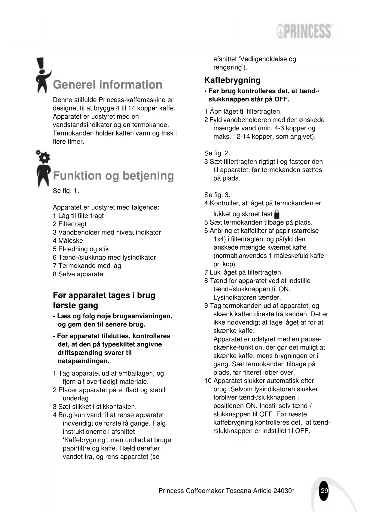 - 2002/96/EC29 Princess Coffeemaker Toscana Article 240301 Generel information Denne stilfulde Princess-kaffemaskine er designet til at brygge 4 til 14 kopper kaffe. Apparatet er udstyret med en vandstandsindikator og en termokande. Termokanden holder kaffen varm og frisk i flere timer. Funktion og betjening Se fig. 1. Apparatet er udstyret med følgende: 1 Låg til filtertragt 2 Filtertragt 3 Vandbeholder med niveauindikator 4 Måleske 5 El-ledning og stik 6 Tænd-/slukknap med lysindikator 7 Termokande med låg 8 Selve apparatet Før apparatet tages i brug første gang