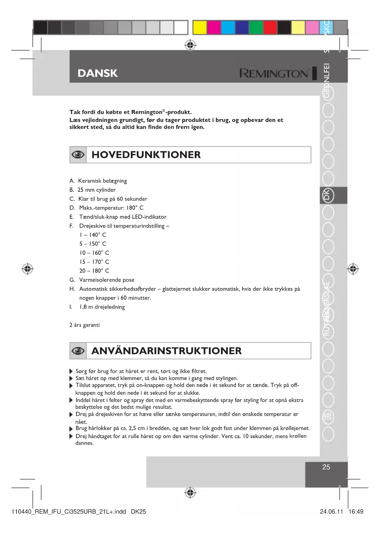 SRB DK Tak fordi du købte et Remington ® -produkt. Læs vejledningen grundigt, før du tager produktet i brug, og opbevar den et sikkert sted, så du altid kan finde den frem igen. HOVEDFUNKTIONER A. Keramisk belægningB. 25 mm cylinderC. Klar til brug på 60 sekunderD. Maks.-temperatur: 180° CE. Tænd/sluk-knap med LED-indikatorF. Drejeskive til temperaturindstilling –1 – 140° C5 – 150° C10 – 160° C15 – 170° C20 – 180° CG. Varmeisolerende pose H. Automatisk sikkerhedsafbryder – glattejernet slukker automatisk, hvis der ikke trykkes på nogen knapper i 60 minutter.I. 1,8 m drejeledning2 års garanti