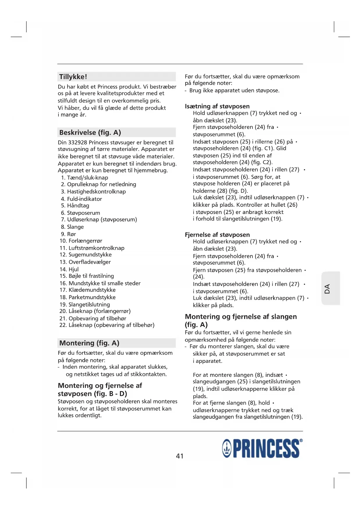 Tillykke! Du har købt et Princess produkt. Vi bestræber os på at levere kvalitetsprodukter med et stilfuldt design til en overkommelig pris. Vi håber, du vil få glæde af dette produkt i mange år. Beskrivelse (fig. A) Din 332928 Princess støvsuger er beregnet til støvsugning af tørre materialer. Apparatet er ikke beregnet til at støvsuge våde materialer. Apparatet er kun beregnet til indendørs brug. Apparatet er kun beregnet til hjemmebrug.