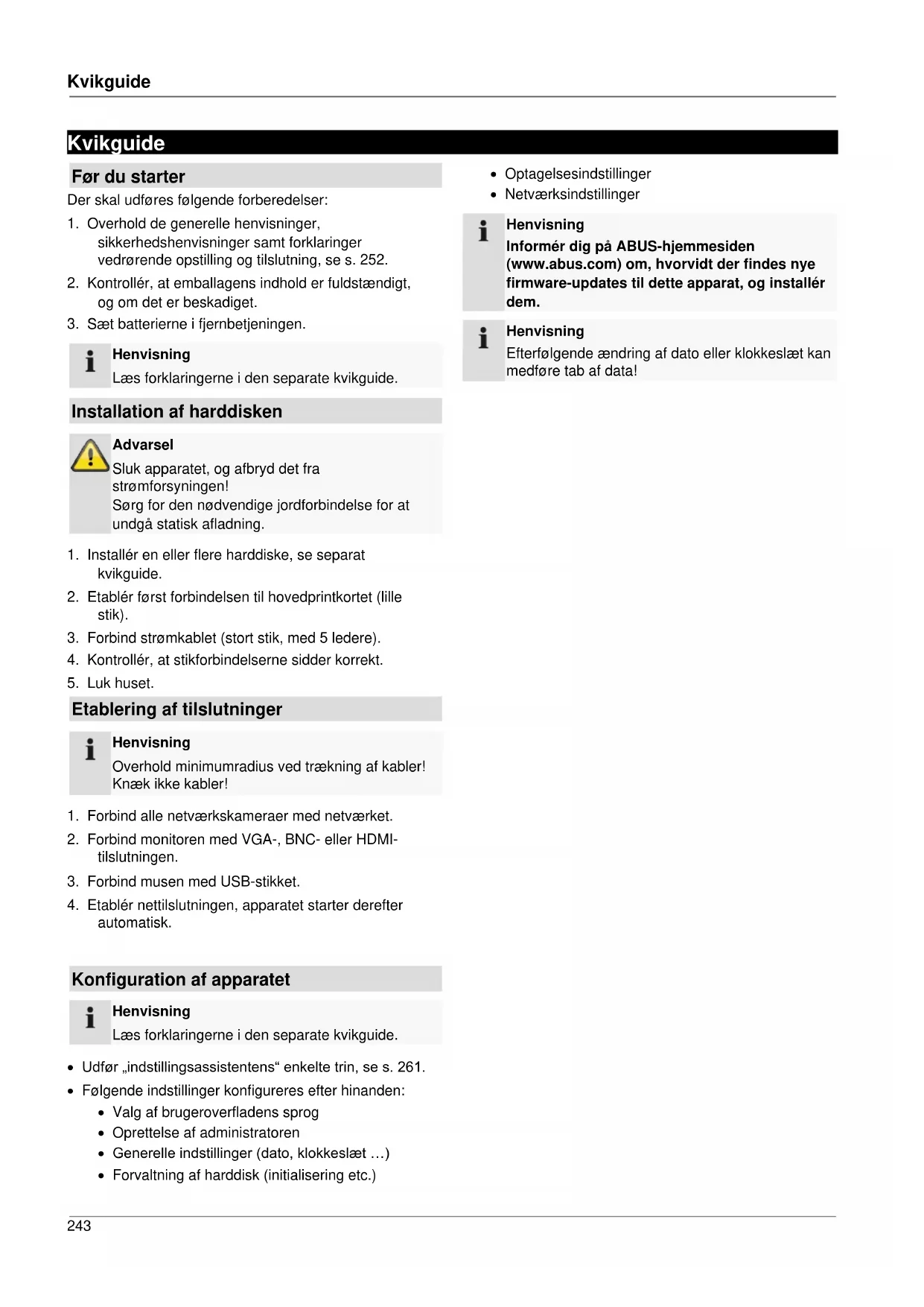 Ved en strømsvigt under driften af apparatet kan data på harddisken mistes. Anvend en nødstrømsforsyning! Harddisken er meget følsom. En ukorrekt betjening eller uegnede omgivelser kan beskadige harddisken efter en driftstid på et par år. Tegn herpå er uventede standsning af afspilningen og synlige mosaik-effekter på billedet. Evt. er der ingen varsler om en defekt ved harddisken. Ved en defekt er det ikke muligt at afspille optagelser. I dette tilfælde skal harddisken udskiftes.ABUS 4/8/16-kanal analog digitaloptager