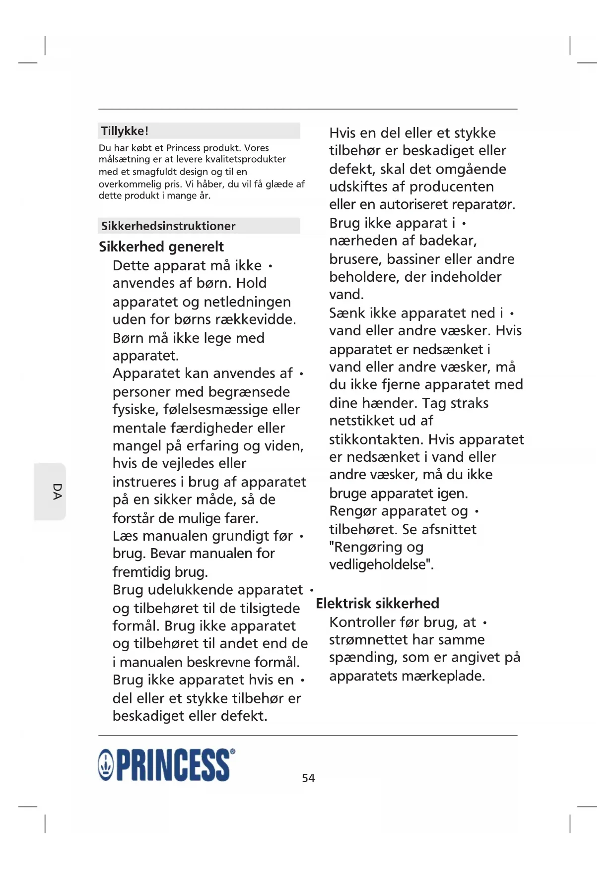 Tillykke! Du har købt et Princess produkt. Vores målsætning er at levere kvalitetsprodukter med et smagfuldt design og til en overkommelig pris. Vi håber, du vil få glæde af dette produkt i mange år. Sikkerhedsinstruktioner Sikkerhed generelt Dette apparat må ikke • anvendes af børn. Hold apparatet og netledningen uden for børns rækkevidde. Børn må ikke lege med apparatet. Apparatet kan anvendes af • personer med begrænsede fysiske, følelsesmæssige eller mentale færdigheder eller mangel på erfaring og viden, hvis de vejledes eller instrueres i brug af apparatet på en sikker måde, så de forstår de mulige farer. Læs manualen grundigt før • brug. Bevar manualen for fremtidig brug. Brug udelukkende apparatet • og tilbehøret til de tilsigtede formål. Brug ikke apparatet og tilbehøret til andet end de i manualen beskrevne formål. Brug ikke apparatet hvis en • del eller et stykke tilbehør er beskadiget eller defekt. Hvis en del eller et stykke tilbehør er beskadiget eller defekt, skal det omgående udskiftes af producenten eller en autoriseret reparatør. Brug ikke apparat i • nærheden af badekar, brusere, bassiner eller andre beholdere, der indeholder vand. Sænk ikke apparatet ned i • vand eller andre væsker. Hvis apparatet er nedsænket i vand eller andre væsker, må du ikke fjerne apparatet med dine hænder. Tag straks netstikket ud af stikkontakten. Hvis apparatet er nedsænket i vand eller andre væsker, må du ikke bruge apparatet igen. Rengør apparatet og • tilbehøret. Se afsnittet "Rengøring og vedligeholdelse". Elektrisk sikkerhed Kontroller før brug, at • strømnettet har samme spænding, som er angivet på apparatets mærkeplade.55