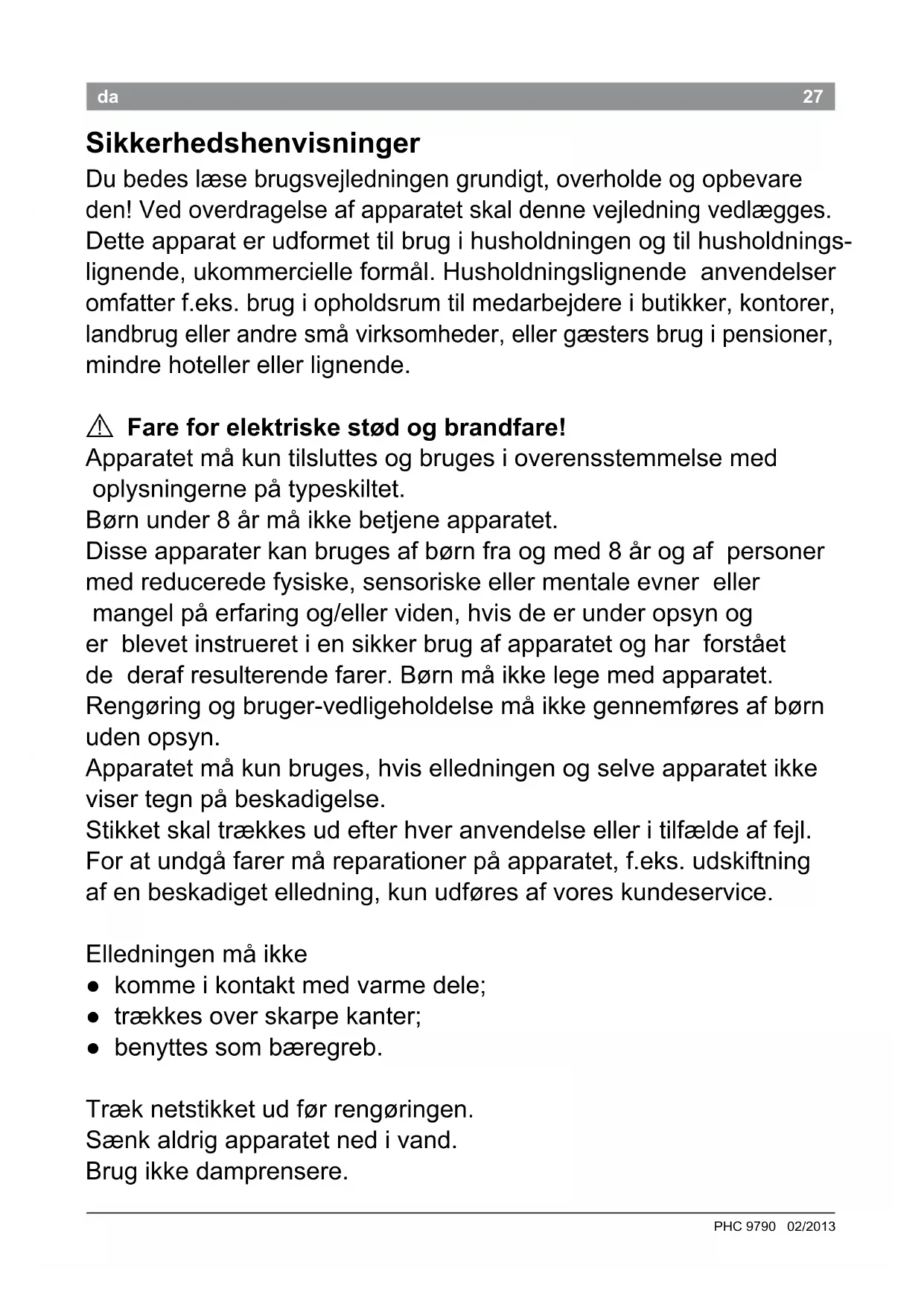 Fare for elektriske stød og brandfare! Apparatet må kun tilsluttes og bruges i overensstemmelse med oplysningerne på typeskiltet. Børn under 8 år må ikke betjene apparatet. Disse apparater kan bruges af børn fra og med 8 år og af personer med reducerede fysiske, sensoriske eller mentale evner eller mangel på erfaring og/eller viden, hvis de er under opsyn og er blevet instrueret i en sikker brug af apparatet og har forstået de deraf resulterende farer. Børn må ikke lege med apparatet. Rengøring og bruger-vedligeholdelse må ikke gennemføres af børn uden opsyn. Apparatet må kun bruges, hvis elledningen og selve apparatet ikke viser tegn på beskadigelse. Stikket skal trækkes ud efter hver anvendelse eller i tilfælde af fejl. For at undgå farer må reparationer på apparatet, f.eks. udskiftning af en beskadiget elledning, kun udføres af vores kundeservice. Elledningen må ikke ● komme i kontakt med varme dele; ● trækkes over skarpe kanter; ● benyttes som bæregreb. Træk netstikket ud før rengøringen. Sænk aldrig apparatet ned i vand. Brug ikke damprensere.28 Robert Bosch Hausgeräte GmbH 28 da Varmeelementet bliver varmt. Hold kun fast i apparatets håndtag. Må kun anvendes på tørt hår. Må aldrig anvendes på kunstigt hår. Må kun lægges på varmebestandigt underlag. Må ikke benyttes i nærheden af rindende vand eller vand, der er hældt op i enten håndvask, badekar eller andre beholdere.