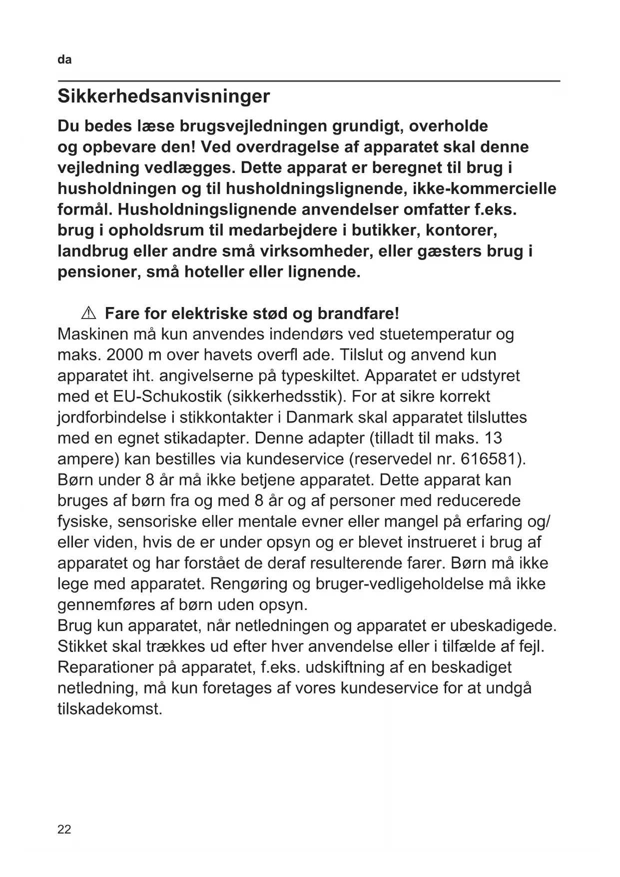 Sikkerhedsanvisninger Du bedes læse brugsvejledningen grundigt, overholde og opbevare den! Ved overdragelse af apparatet skal denne vejledning vedlægges. Dette apparat er beregnet til brug i husholdningen og til husholdningslignende, ikke-kommercielle formål. Husholdningslignende anvendelser omfatter f.eks. brug i opholdsrum til medarbejdere i butikker, kontorer, landbrug eller andre små virksomheder, eller gæsters brug i pensioner, små hoteller eller lignende. A Fare for elektriske stød og brandfare! Maskinen må kun anvendes indendørs ved stuetemperatur og maks. 2000 m over havets over ade. Tilslut og anvend kun apparatet iht. angivelserne på typeskiltet. Apparatet er udstyret med et EU-Schukostik (sikkerhedsstik). For at sikre korrekt jordforbindelse i stikkontakter i Danmark skal apparatet tilsluttes med en egnet stikadapter. Denne adapter (tilladt til maks. 13 ampere) kan bestilles via kundeservice (reservedel nr. 616581). Børn under 8 år må ikke betjene apparatet. Dette apparat kan bruges af børn fra og med 8 år og af personer med reducerede fysiske, sensoriske eller mentale evner eller mangel på erfaring og/ eller viden, hvis de er under opsyn og er blevet instrueret i brug af apparatet og har forstået de deraf resulterende farer. Børn må ikke lege med apparatet. Rengøring og bruger-vedligeholdelse må ikke gennemføres af børn uden opsyn. Brug kun apparatet, når netledningen og apparatet er ubeskadigede. Stikket skal trækkes ud efter hver anvendelse eller i tilfælde af fejl. Reparationer på apparatet, f.eks. udskiftning af en beskadiget netledning, må kun foretages af vores kundeservice for at undgå tilskadekomst.23