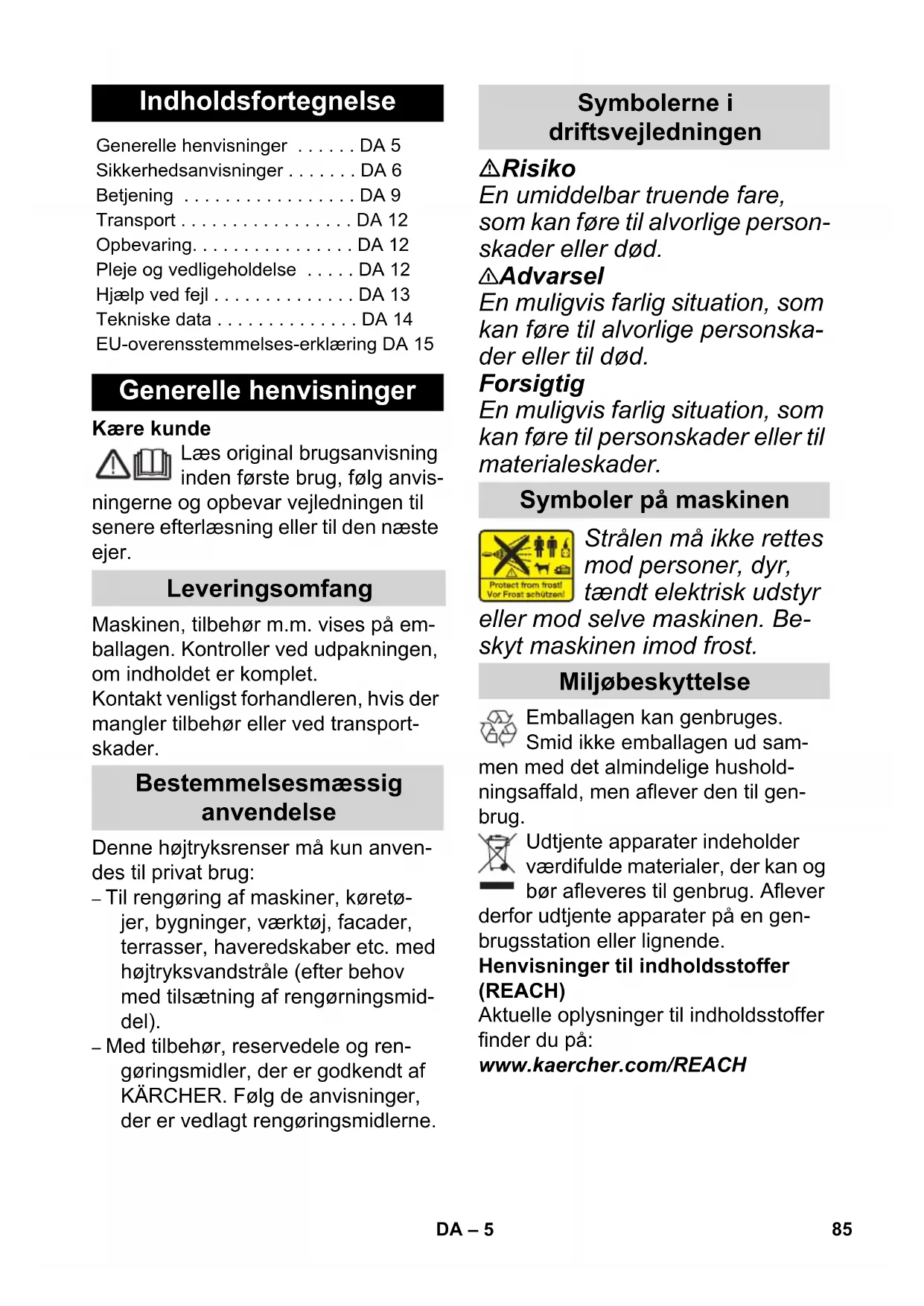 EN 61000–3–3: 2008 EN 62233: 2008 Processo aplicado de avaliação de conformidade 2000/14/CE: Anexo V Nível de potência acústica dB(A) Medido: 87 Garantido: 90 CEO Head of Approbation Winnenden, 2013/07/01 84 PT– 5 Kære kunde Læs original brugsanvisning inden første brug, følg anvis- ningerne og opbevar vejledningen til senere efterlæsning eller til den næste ejer. Maskinen, tilbehør m.m. vises på em- ballagen. Kontroller ved udpakningen, om indholdet er komplet. Kontakt venligst forhandleren, hvis der mangler tilbehør eller ved transport- skader. Denne højtryksrenser må kun anven- des til privat brug: – Til rengøring af maskiner, køretø- jer, bygninger, værktøj, facader, terrasser, haveredskaber etc. med højtryksvandstråle (efter behov med tilsætning af rengørningsmid- del). – Med tilbehør, reservedele og ren- gøringsmidler, der er godkendt af KÄRCHER. Følg de anvisninger, der er vedlagt rengøringsmidlerne. Risiko En umiddelbar truende fare, som kan føre til alvorlige person- skader eller død. 몇 Advarsel En muligvis farlig situation, som kan føre til alvorlige personska- der eller til død. Forsigtig En muligvis farlig situation, som kan føre til personskader eller til materialeskader. Strålen må ikke rettes mod personer, dyr, tændt elektrisk udstyr eller mod selve maskinen. Be- skyt maskinen imod frost. Emballagen kan genbruges. Smid ikke emballagen ud sam- men med det almindelige hushold- ningsaffald, men aflever den til gen- brug. Udtjente apparater indeholder værdifulde materialer, der kan og bør afleveres til genbrug. Aflever derfor udtjente apparater på en gen- brugsstation eller lignende. Henvisninger til indholdsstoffer (REACH) Aktuelle oplysninger til indholdsstoffer finder du på: www.kaercher.com/REACH Indholdsfortegnelse Generelle henvisninger . . . . . . DA 5 Sikkerhedsanvisninger . . . . . . . DA 6 Betjening . . . . . . . . . . . . . . . . . DA 9 Transport . . . . . . . . . . . . . . . . . DA 12 Opbevaring. . . . . . . . . . . . . . . . DA 12 Pleje og vedligeholdelse . . . . . DA 12 Hjælp ved fejl . . . . . . . . . . . . . . DA 13 Tekniske data . . . . . . . . . . . . . . DA 14 EU-overensstemmelses-erklæring DA 15 Generelle henvisninger Leveringsomfang Bestemmelsesmæssig anvendelse Symbolerne i driftsvejledningen Symboler på maskinen Miljøbeskyttelse 85DA– 6 I de enkelte lande gælder de af vore forhandlere fastlagte garantibetingel- ser. Eventuelle fejl på apparatet af- hjælpes gratis inden for garantien, så- fremt fejlen kan tilskrives en materiale- eller produktionsfejl. Hvis De ønsker at gøre garantien gældende, bedes De henvende Dem til Deres forhandler el- ler nærmeste kundeservice medbrin- gende kvittering for købet. (Se adressen på bagsiden) Risiko Rør aldrig ved netstik og stik- kontakt med fugtige hænder. Tag ikke maskinen i brug, hvis strømtilslutningslednin- gen eller vigtige dele af ma- skinen, som f.eks. sikker- hedselementer, højtryksslan- ger eller sprøjtepistoler, er beskadigede. Kontroller altid tilslutningsled- ningen og netstikket for ska- der, før maskinen tages i brug. En beskadiget tilslut- ningsledning skal omgående udskiftes af en autoriseret kundeserviceafdeling/el-in- stallatør. Kontroller altid højtryksslan- gen for beskadigelser, før den tages i brug. Udskift høj- tryksslangen med det sam- me, hvis den er beskadiget. Det er forbudt at bruge høj- tryksrenseren i områder, hvor der er eksplosionsfare. Overhold de gældende sik- kerhedsforskrifter ved anven- delse af højtryksrenseren i fa- reområder (f.eks. tankstatio- ner). Højtryksstråler kan være farli- ge, hvis de ikke anvendes korrekt. Strålen må ikke ret- tes mod personer, dyr, tændt elektrisk udstyr eller mod høj- tryksrenseren. Ret ikke strålen mod Dem selv eller andre for at rengøre tøj eller skotøj. Spul ikke genstande, der in- deholder sundhedsskadelige stoffer (f.eks. asbest). Dæk/dækventiler kan beska- diges og punktere ved brug af højtryksstrålen. Første tegn herpå er, at dækkene ændrer farve. Beskadigede dæk/ dækventiler er livsfarlige. Hold mindst 30 cm stråleaf- stand ved rengøringen! Eksplosionsrisiko! Brændbare væsker må ikke sprøjtes. Opsug aldrig opløsningsmid- delholdige væsker eller ufor- tyndede syrer og opløsningsmidler! Herunder hører f.eks. benzin, farve- fortynder og fyringsolie. Sprøjtetågen er meget let an- tændelig, eksplosiv og giftig. Undgå brug af acetone, ufor- tyndede syrer og opløsnings- midler, da disse angriber maskinens materialer. Garanti Sikkerhedsanvisninger 86 DA– 7 몇 Advarsel Stikket og koblingen af for- længerledninger skal være vandtæt og må ikke ligge i vand. Koblingen må ej heller ligge på jorden. Det anbefa- les at bruge kabeltromler, der sikrer, at stikkontakterne er mindst 60 mm over jorden. Uegnede el-forlængerlednin- ger kan være farlige. Benyt udelukkende hertil godkendte og mærkede el-forlængerled- ninger med et tilstrækkeligt stort ledningstværsnit ved udendørs brug: 1 - 10 m: 1,5