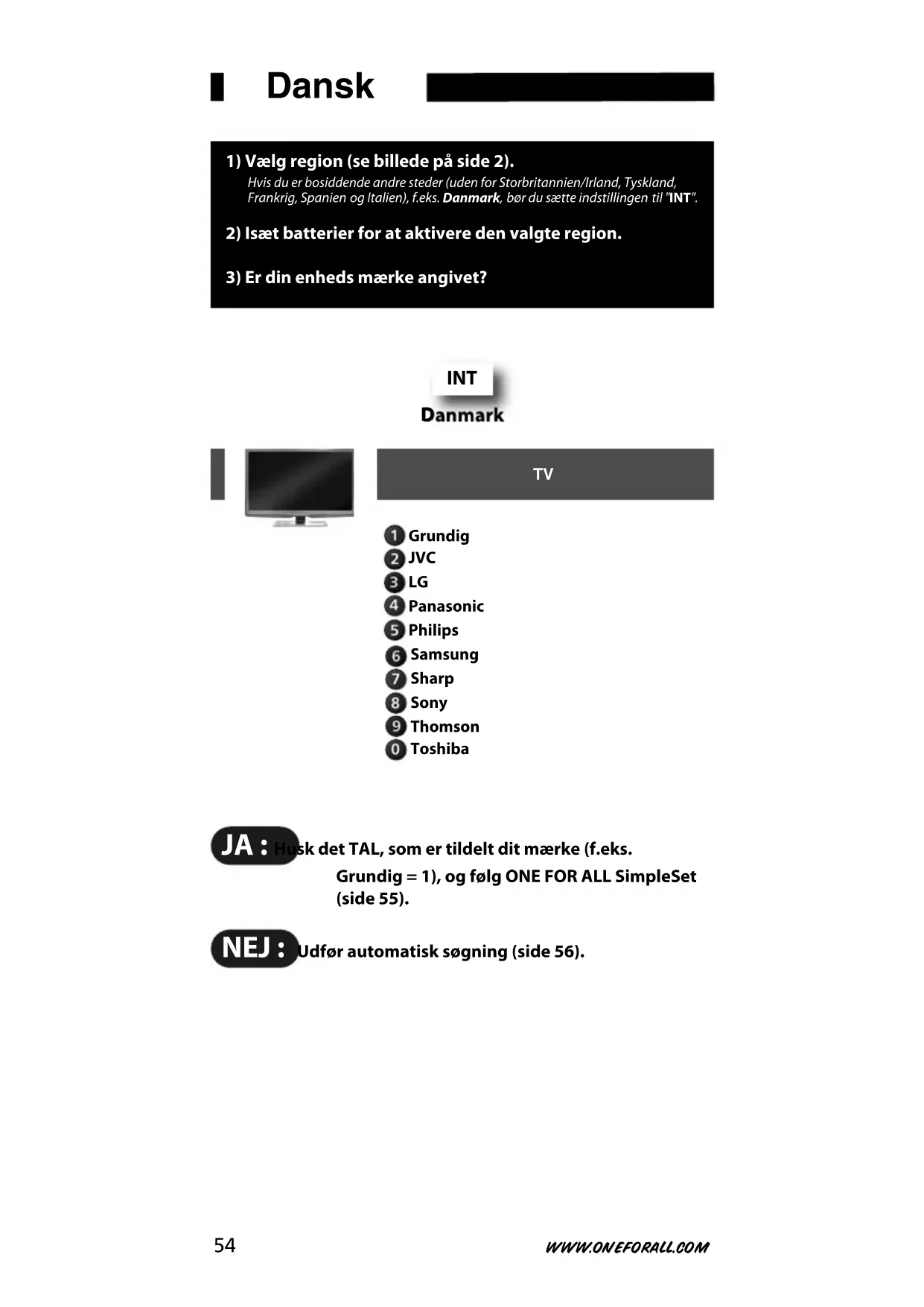 ONE FOR ALL SimpleSet Giver dig mulighed for at indstille de fleste kendte mærker på få minutter.Du skal blot finde den TALKODE, som er tildelt dit mærke (side 54), og følgetrinnene A-B.
