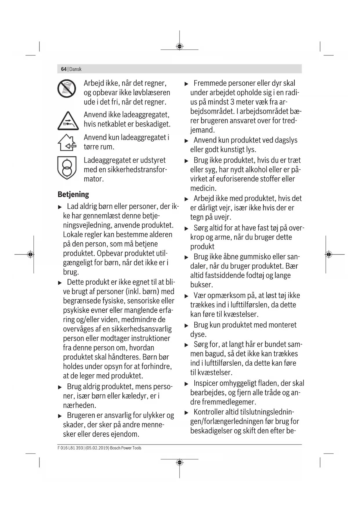 = 1,5 Montering u Bemærk: Sluk for haveredskabet og fjern akkuen, før indstillings- eller rengøringsarbejde gennemføres. Dyse monteres (se Fig.B) Skub dysen (5) fast på motorenheden. Pas på, at fingrene ikke kommer til klemme under monteringen. Akku sættes i/tages ud (se Fig. C) Bemærk: Anvendes ikke egnede akkuer, kan dette føre til fejlfunktioner eller til beskadigelse af produktet. Sæt den opladte akku (6) i. Sikr, at akkuen er sat rigtigt i. Akkuen (6) tages ud af produktet ved at trykke på akku-udlø- serknappen og trække akkuen ud. Ibrugtagning u Tag akkuen ud af haveredskabet, før der arbejdes på haveredskabet (f.eks. vedligeholdelse, værktøjsskift osv.), samt før det transporteres og lægges til opbeva- ring. Utilsigtet aktivering af start-stop-kontakten er for- bundet med kvæstelsesfare. u Haveredskabet fortsætter med at løbe i endnu et par sekunder, efter det er blevet slukket (vedvarende luftstrøm). Lad motoren løbe ud, før den tændes igen. Sluk og tænd ikke for haveredskabet umiddelbart ef- ter hinanden. Akku lades u Kontroller netspændingen! Strømkildens spænding skal stemme overens med angivelserne på ladeaggre- gatets typeskilt. Ladeaggregater til 230 V kan også til- sluttes 220 V. Akkuen er udstyret med en temperaturovervågning, som kun tillader ladning i et temperaturområde mellem 0 °C og 45 °C. Derved opnås en lang levetid for akkuen. Bemærk: Akkuen er delvist opladet, når den udleveres. For at sikre at akkuen fungerer 100% lades akkuen fuldstændigt i ladeaggregatet før første ibrugtagning. Li-Ion-akkuen kan oplades til enhver tid, uden at levetiden forkortes. En afbrydelse af opladningen beskadiger ikke ak- kuen. Li-Ion-akkuen er beskyttet mod dybafladning via „Electronic Cell Protection (ECP)“. Er akkuen afladet, slukkes produktet med en beskyttelseskontakt: Haveredskabet arbejder ikke mere. Tryk ikke mere på start-stop-kontakten efter automatisk slukning af produktet. Akkuen kan blive beskadiget. Opladning Opladningen starter, så snart ladeaggregatets netstik sættes i stikdåsen og akkuen placeres i ladeaggregatet . Den intelligente ladeproces gør, at akkuens ladetilstand au- tomatisk erkendes, og at den optimale ladestrøm vælges, af- hængigt af akkutemperatur og akkuspænding. Derved skånes akkuen, desuden er den altid opladet 100%, når den opbevares i ladeaggregatet. Betydning af de forskellige displayelementer på ladeaggregatet (AL 3620 CV/AL 3640 CV/AL 36V-20) Hurtig opladning Lynopladningen signaliseres ved, at den grøn- ne akku-kontrollampe blinker. Lampeelement på akkuen: Under opladningen lyser og slukker akkuens tre grønne LED-lamper kort en ad gangen. Akkuen er helt opladet, når de tre grønne LED-lam- per lyser hele tiden. Ca. 5 minutter efter at akkuen er helt opladet, slukker de tre grønne LED-lamper. Bemærk: Hurtigopladningen er kun mulig, hvis akkuens tem- peratur er i det tilladte ladetemperaturområde, se afsnit "Tekniske data". Akku opladet Når den grønne LED-lampe lyser konstant, betyder det, at akkuen er helt opladet. Der høres desuden en signaltone i ca. 2 sekun- der, hvilket signaliserer, at akkuen er 100% opladt. Herefter kan akkumulatoren tages ud til øjeblikkelig brug. Er akkuen ikke sat i, betyder konstant lys i LED-lampen, at netstikket er sat i stikdåsen, og at ladeaggregatet er klart. Akku-temperatur under 0 °C eller over 45 °C Når den røde LED-lampe lyser konstant, bety- der det, at akkuens temperatur er uden for det tilladte ladetemperaturområde, se afsnit "Tek- niske data". Så snart det tilladte temperaturområde er nået, skifter ladeaggregatet automatisk til lynopladning. Er akkuens temperatur uden for det tilladte ladetemperatur- område, lyser akkuens røde LED-lampe, når akkuen sættes i ladeaggregatet. Opladning er ikke mulig Hvis opladningen ikke er mulig på grund af en anden fejl, signaliseres dette ved, at den røde LED-lampe blinker. Opladningen kan ikke starte, og det er ikke muligt at oplade akkuen (se afsnit "Fejlsøgning"). F 016 L81 393 | (05.02.2019) Bosch Power ToolsDansk | 69 Tips vedr. opladning Ladeaggregatet kan blive varmt, hvis det oplades hele tiden, eller en opladningscyklus følger den næste uden afbrydelser. Dette er dog uden betydning, og er ikke tegn på en teknisk defekt af ladeaggregatet. Når driftstiden efter opladningen forkortes væsentligt, er det tegn på, at akkuen er slidt op og skal udskiftes. Læs og overhold henvisningerne mht. bortskaffelse. Akku-køling (Active Air Cooling) Blæserstyringen, der er integreret i ladeaggregatet, overvå- ger temperaturen af det isatte batteri. Ligger akkutempera- turen over 30 °C, køles akkuen til den optimale ladetempera- tur vha. en ventilator. Den tændte blæser afgiver blæserstøj. Hvis blæseren ikke kører, ligger batteritemperaturen i det optimale ladetemperaturområde, eller blæseren er defekt. I dette tilfælde forlænges akkuens ladetid. Tips vedr. opladning Ladeaggregatet kan blive varmt, hvis det oplades hele tiden, eller en opladningscyklus følger den næste uden afbrydelser. Dette er dog uden betydning, og er ikke tegn på en teknisk defekt af ladeaggregatet. Når driftstiden efter opladningen forkortes væsentligt, er det tegn på, at akkuen er slidt op og skal udskiftes. Læs og overhold henvisningerne mht. bortskaffelse. Betjening u Bemærk: Sluk for haveredskabet og fjern akkuen, før indstillings- eller rengøringsarbejde gennemføres. Tænde og slukke (se Fig. D) Produktet tændes ved at dreje start-stop-kontakten (1) til- bage. Luftstrømhastigheden er variabel. Lufthastigheden øges ved at dreje start-stop-kontakten (1) tilbage. Lufthastigheden re- duceres ved at dreje start-stop-kontakten (1) fremad. Produktet slukkes ved at dreje start-stop-kontakten (1) helt fremad. Afmontering (se Fig. B) Tryk knappen (2) ind og tag dysen (5) af. Arbejdshenvisning (se Fig. E) Hold altid haveredskabet ca. 3 cm over jorden under ar- bejdet. Blæs ikke varme, brændbare eller 