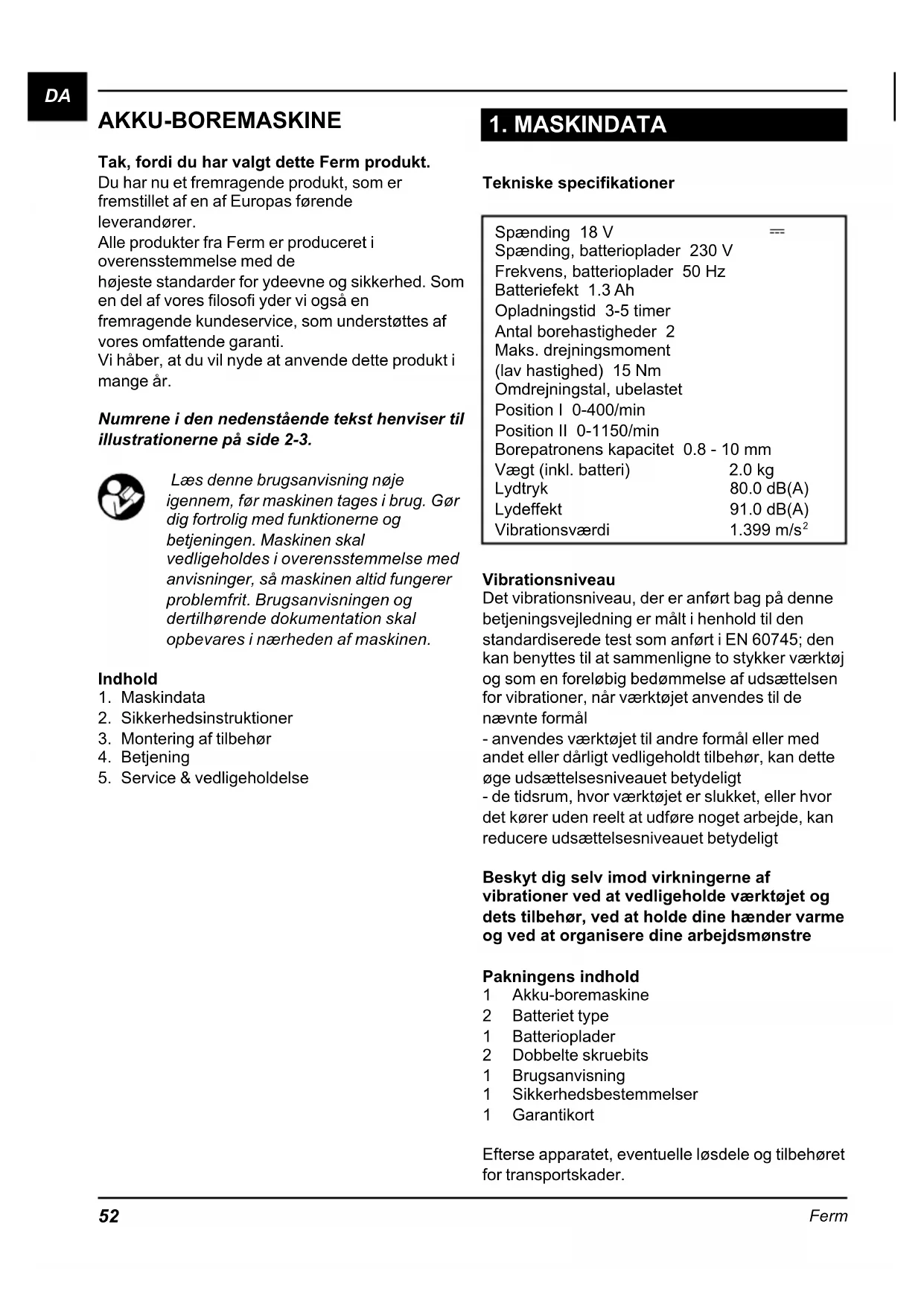 Vibrationsniveau Det vibrationsniveau, der er anført bag på denne betjeningsvejledning er målt i henhold til den standardiserede test som anført i EN 60745; den kan benyttes til at sammenligne to stykker værktøj og som en foreløbig bedømmelse af udsættelsen for vibrationer, når værktøjet anvendes til de nævnte formål - anvendes værktøjet til andre formål eller med andet eller dårligt vedligeholdt tilbehør, kan dette øge udsættelsesniveauet betydeligt - de tidsrum, hvor værktøjet er slukket, eller hvor det kører uden reelt at udføre noget arbejde, kan reducere udsættelsesniveauet betydeligt Beskyt dig selv imod virkningerne af vibrationer ved at vedligeholde værktøjet og dets tilbehør, ved at holde dine hænder varme og ved at organisere dine arbejdsmønstre Pakningens indhold 1 Akku-boremaskine 2 Batteriet type 1 Batterioplader 2 Dobbelte skruebits 1 Brugsanvisning 1 Sikkerhedsbestemmelser 1 Garantikort Efterse apparatet, eventuelle løsdele og tilbehøret for transportskader. DA53 Ferm Produktoplysninger Fig. A