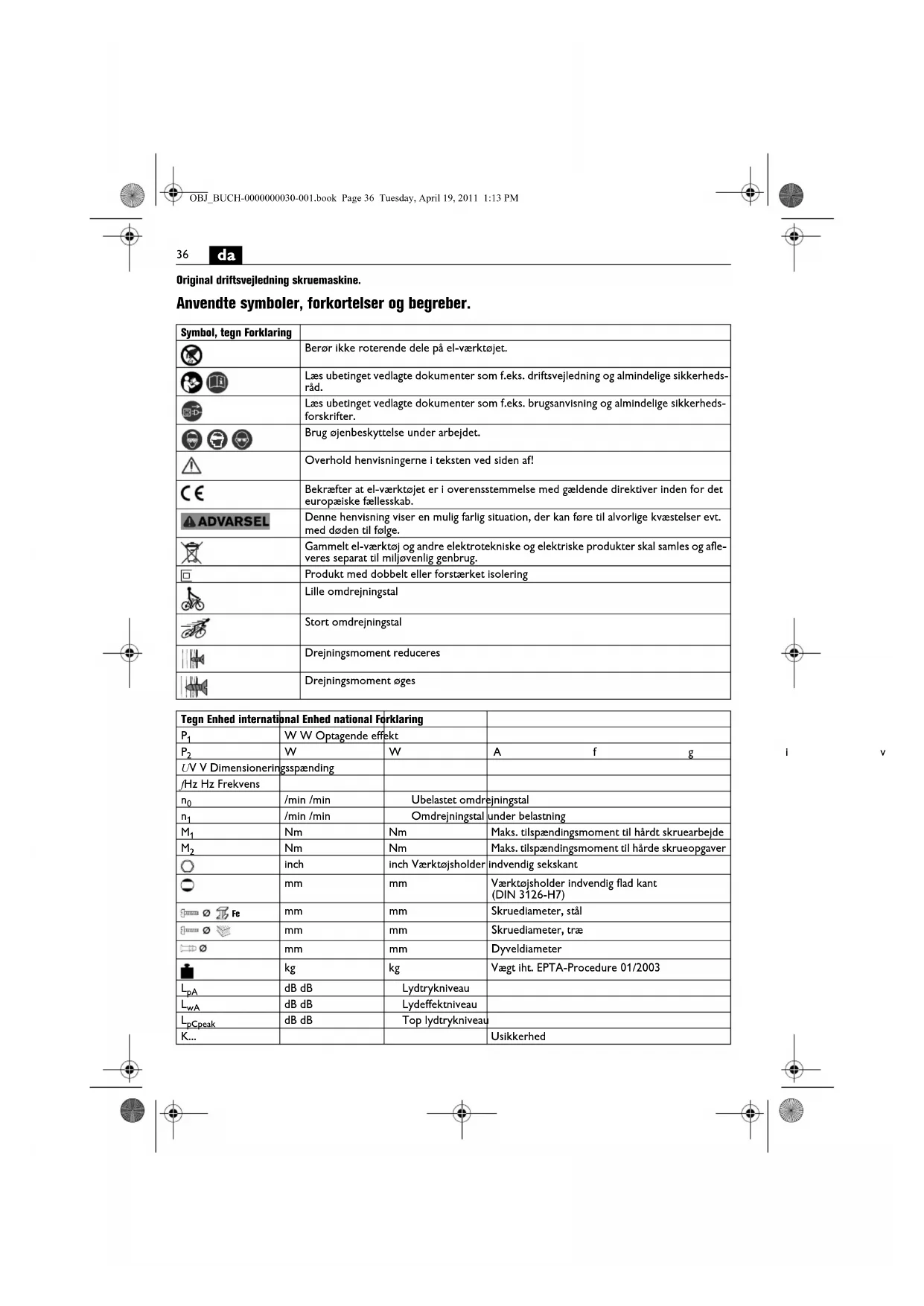 Original driftsvejledning skruemaskine. Anvendte symboler, forkortelser og begreber. Symbol, tegn Forklaring Berør ikke roterende dele på el-værktøjet. Læs ubetinget vedlagte dokumenter som f.eks. driftsvejledning og almindelige sikkerheds- råd. Læs ubetinget vedlagte dokumenter som f.eks. brugsanvisning og almindelige sikkerheds- forskrifter. Brug øjenbeskyttelse under arbejdet. Overhold henvisningerne i teksten ved siden af! Bekræfter at el-værktøjet er i overensstemmelse med gældende direktiver inden for det europæiske fællesskab. Denne henvisning viser en mulig farlig situation, der kan føre til alvorlige kvæstelser evt. med døden til følge. Gammelt el-værktøj og andre elektrotekniske og elektriske produkter skal samles og afle- veres separat til miljøvenlig genbrug. Produkt med dobbelt eller forstærket isolering Lille omdrejningstal Stort omdrejningstal Drejningsmoment reduceres Drejningsmoment øges Tegn Enhed international Enhed national Forklaring