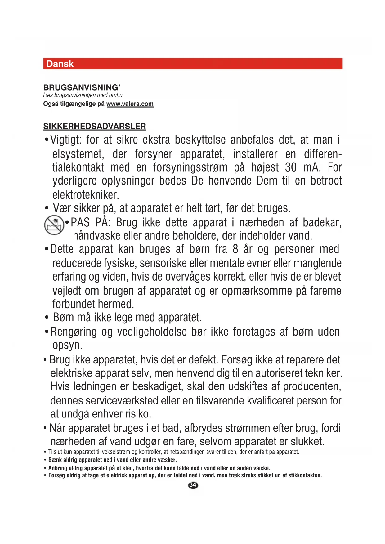 • Forsøg aldrig at tage et elektrisk apparat op, der er faldet ned i vand, men træk straks stikket ud af stikkontakten.