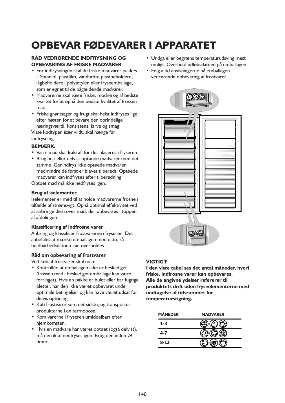 Le tableau ci-contre répertorie les durées maximales de conservation des aliments frais congelés. Toutes les prestations énoncées se réfèrent au fonctionnement de l'appareil sans les blocs réfrigérants, à l'exception du temps de remontée de la température