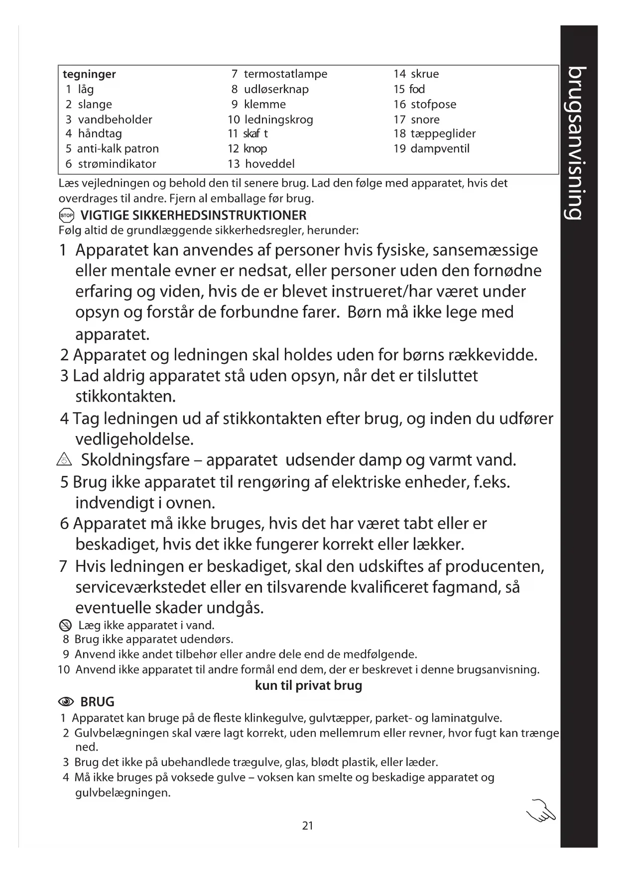 Følg altid de grundlæggende sikkerhedsregler, herunder: 1 Apparatet kan anvendes af personer hvis fysiske, sansemæssige eller mentale evner er nedsat, eller personer uden den fornødne erfaring og viden, hvis de er blevet instrueret/har været under opsyn og forstår de forbundne farer. Børn må ikke lege med apparatet. 2 Apparatet og ledningen skal holdes uden for børns rækkevidde. 3 Lad aldrig apparatet stå uden opsyn, når det er tilsluttet stikkontakten. 4 Tag ledningen ud af stikkontakten efter brug, og inden du udfører vedligeholdelse. $ Skoldningsfare – apparatet udsender damp og varmt vand. 5 Brug ikke apparatet til rengøring af elektriske enheder, f.eks. indvendigt i ovnen. 6 Apparatet må ikke bruges, hvis det har været tabt eller er beskadiget, hvis det ikke fungerer korrekt eller lækker. 7 Hvis ledningen er beskadiget, skal den udskiftes af producenten, serviceværkstedet eller en tilsvarende kvalificeret fagmand, så eventuelle skader undgås. H Læg ikke apparatet i vand. 8 Brug ikke apparatet udendørs. 9 Anvend ikke andet tilbehør eller andre dele end de medfølgende. 10 Anvend ikke apparatet til andre formål end dem, der er beskrevet i denne brugsanvisning. kun til privat brug C BRUG 1 Apparatet kan bruge på de fleste klinkegulve, gulvtæpper, parket- og laminatgulve. 2 Gulvbelægningen skal være lagt korrekt, uden mellemrum eller revner, hvor fugt kan trænge ned. 3 Brug det ikke på ubehandlede trægulve, glas, blødt plastik, eller læder. 4 Må ikke bruges på voksede gulve – voksen kan smelte og beskadige apparatet og gulvbelægningen. brugsanvisning tegninger 1 låg 2 slange 3 vandbeholder 4 håndtag 5 anti-kalk patron 6 strømindikator 7 termostatlampe 8 udløserknap 9 klemme 10 ledningskrog 11 skaf t 12 knop 13 hoveddel 14 skrue 15 fod 16 stofpose 17 snore 18 tæppeglider 19 dampventil22 5 Afprøv det på et ikke iøjnefaldende område af gulvet og se efter, om fugten trænger ned og/ eller skader, inden du fortsætter. , Hvis du er i tvivl, kan du rådføre dig med forhandleren angående gulvbelægningen. d SAMLING 6 Fjern skruen på fodens bagside. 7 Montér hoveddelen på foden. 8 Sæt skruen tilbage i hullet i bunden af hoveddelen. 9 Tryk bunden af skaftet ned i hoveddelens øverste del. 10 Drej skaftet indtil knoppen går i hullet i hoveddelen. 11 Vikl ledningen rundt om ledningskrogene. C STOFPOSEN 12 Løsn snorene. 13 Montér stofposen på foden. 14 Før stofposens kanter op og over flangen rundt langs foden. 15 Stram snorene så stofposen sidder godt fast på foden. C OPFYLDNING 16 Tag op af vandbeholderen og ud af hoveddelen. 17 Vend vandbeholderen på hovedet og skru låget af. 18 Tag låg og slange ud af vandbeholderen. 19 Fyld vandbeholderen op med koldt fersk vand. , Hæld ikke noget i vandet – apparatet kan tage skade, og anti-kalk patronen ødelægges. 20 Sæt slangen ned i vandbeholderen og skru låget på. 21 Vend vandbeholderen om igen og sæt den tilbage i hoveddelen. C VIP ELLER LÅS? 22 Samlingen hvor hoveddelen møder foden har to positioner. 23 Hold apparatets fod forsigtigt fast med din fod, mens du skifter position. 24 Skub håndtaget fremad for at låse håndtaget/hoveddelen i lodret position. 25 Træk håndtaget tilbage for at oplåse håndtaget/hoveddelen, så foden bevæges frit (som en lodret støvsuger).