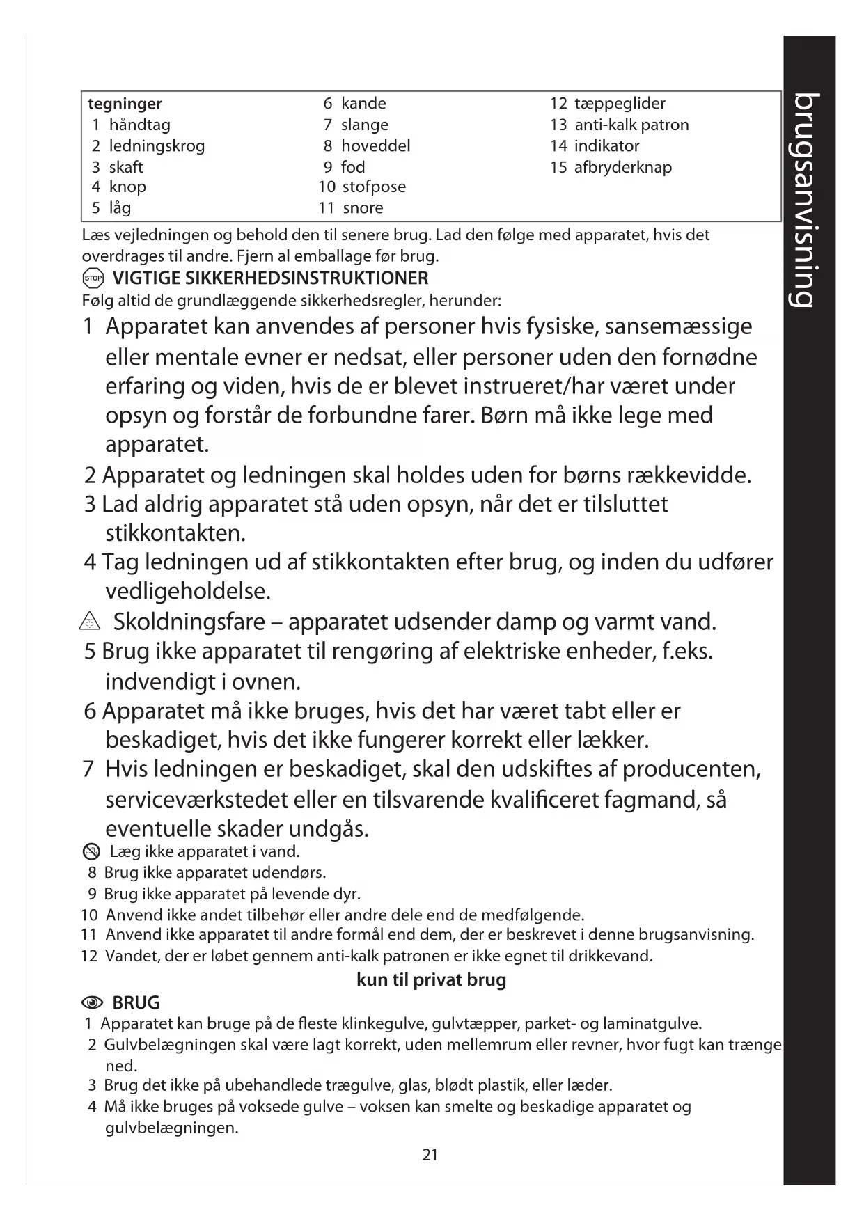4 Må ikke bruges på voksede gulve – voksen kan smelte og beskadige apparatet og