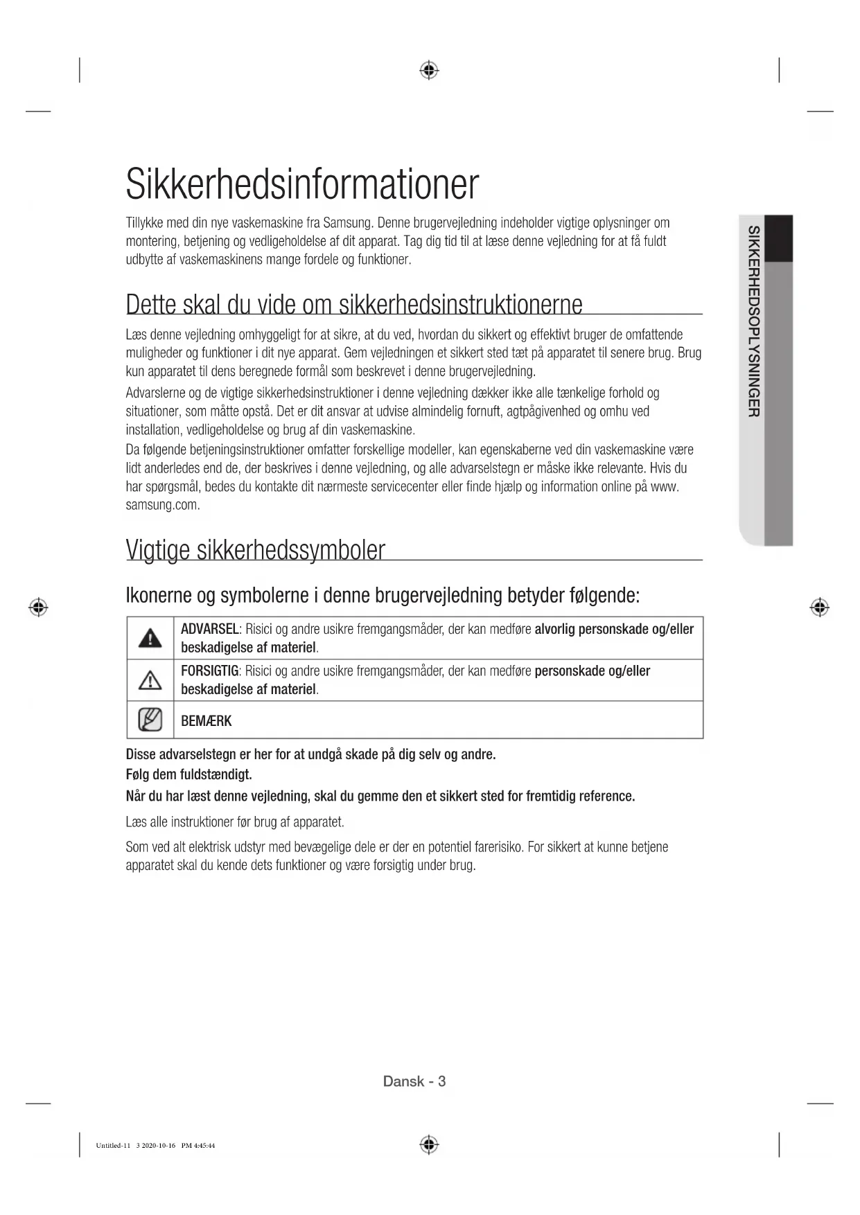 Tillykke med din nye vaskemaskine fra Samsung. Denne brugervejledning indeholder vigtige oplysninger om