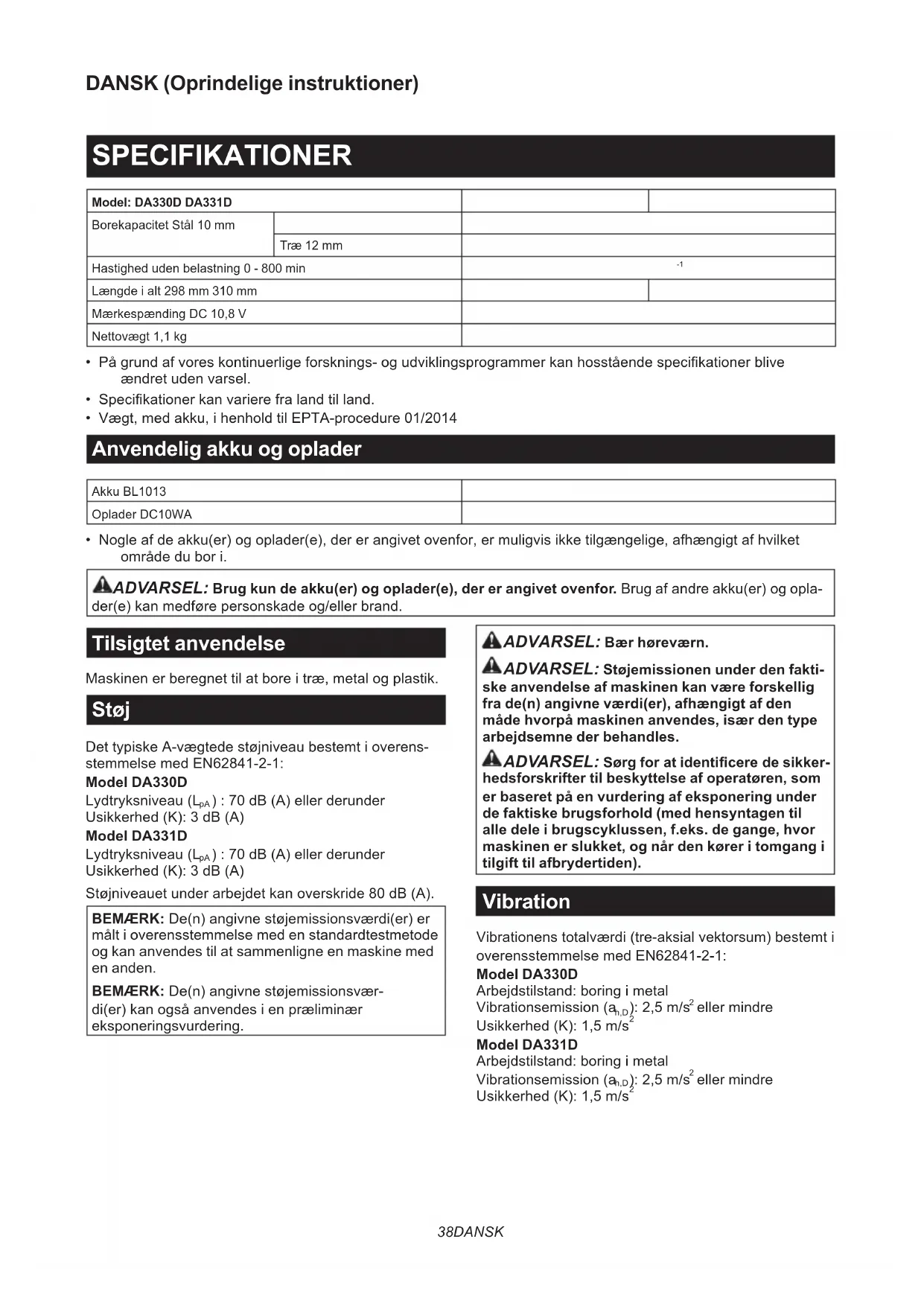 ADVARSEL: Brug kun de akku(er) og oplader(e), der er angivet ovenfor. Brug af andre akku(er) og opla-