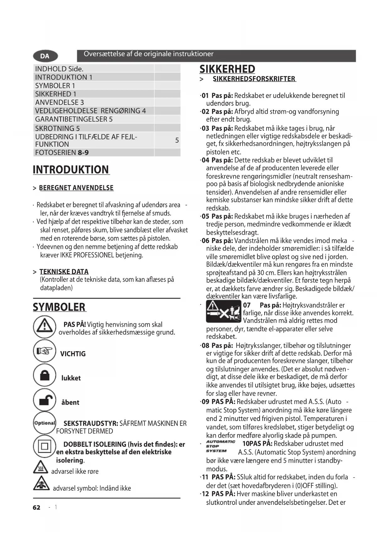 - Ydeevnen og den nemme betjening af dette redskab kræver IKKE PROFESSIONEL betjening. > TEKNISKE DATA (Kontroller at de tekniske data, som kan aflæses på datapladen) SYMBOLER PAS PÅ! Vigtig henvisning som skal overholdes af sikkerhedsmæssige grund. VICHTIG lukket åbent
