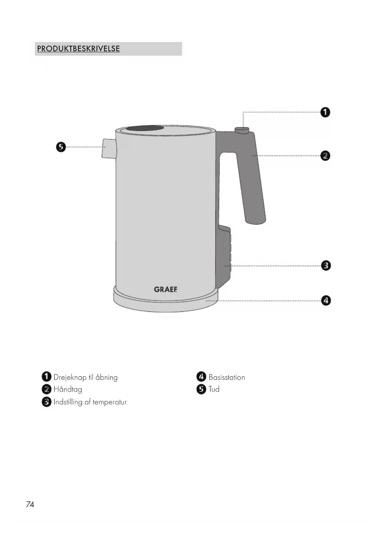 Denne betjeningsvejledning er en del af vandkogeren (efterfølgende kaldet maskinen), og gi- ver vigtige anvisninger for brug, sikkerhed, den korrekte anvendelse samt vedligeholdelse af maskinen. Denne betjeningsvejledning skal være tilgængelig ved maskinen. Den skal læses og overhol- des af enhver person, som er involveret i følgende: ● Idriftsættelse, ● Betjening, ● Fejlfi nding og/eller ● Rengøring Opbevar omhyggeligt denne betjeningsvejledning, og giv den videre til den efterfølgende ejer. Denne betjeningsvejledning kan dog ikke tage alle tænkelige situationer i betragtning. For yder- ligere oplysninger eller problemer der ikke er gennemgået tilstrækkeligt i denne vejledning, bedesdu kontakte Graef kundeservice, eller din forhandler. ADVARSEL I denne betjeningsvejledning anvendes de følgende advarsler og signalord: ADVARSEL Dette indikerer en mulig farlig situation. En manglende overholdelse af henvisningen kan medføre alvorlige kvæstelser, og endda dødsfald. FORSIGTIG Dette indikerer en mulig farlig situation. En manglende overholdelse af anvisningerne kan medføre materielle skader. VIGTIGT! Dette angiver anvendelsestips og anden vigtig information!76 GENERELLE SIKKERHEDSANVISNINGER Denne maskine overholder alle foreskrevne sikkerhedsbestemmelser. Ikke korrekt brug kan dog føre til skader på personer eller materielle skader. Vær opmærksom på følgende sikkerhedsanvisninger for en sikker brug af maskinen: ● Kontrollér maskinen for udvendige, synlige skader på kabinettet, tilslut- ningsledningen og -stikket, før den anvendes. En beskadiget maskine må ikke tages i brug. ● Reparationer må kun udføres af fagfolk eller af Graef-kundeservice. Ikke korrekte reparationer kan forårsage betydelige farer for brugeren. Desuden bortfalder garantikravet. ● Defekte komponenter må kun udskiftes med originale reservedele. Kun for disse dele er det garanteret, at de opfylder sikkerhedskravene. ● Denne maskine må ikke anvendes af børn. Maskinen og dens tilslut- ningsledning skal holdes væk fra børn. ● Børn skal være under opsyn for at sikre, at de ikke leger med maskinen. ● Denne enhed kan bruges af personer med nedsatte fysiske, sensoriske eller mentale evner eller med manglende erfaring og/eller viden, hvis de er under opsyn eller er blevet instrueret i en sikker brug af maski- nen, og hvis de forstår de eventuelle faresituationer som kan opstå. Maskinen er ikke beregnet til anvendelse med en ekstern timer eller en separat fjernstyring. ● Maskinen er ikke beregnet til anvendelse med en ekstern timer eller en separat fjernstyring. ● Træk altid forsyningsledningen ud af stikkontakten i tilslutningsstikket, ikke i tilslutningsledningen. ● Maskinen må ikke anvendes, hvis elledningen eller stikket er beskadi- get. ● Undgå, at der kommer væske på stikket. ● Hvis tilslutningsledningen er beskadiget, må den kun erstattes af produ- centen, dennes kundeservice eller en tilsvarende kvalificeret person, for at forhindre farer. ● Maskinens kabinet må under ingen omstændigheder åbnes. Hvis77