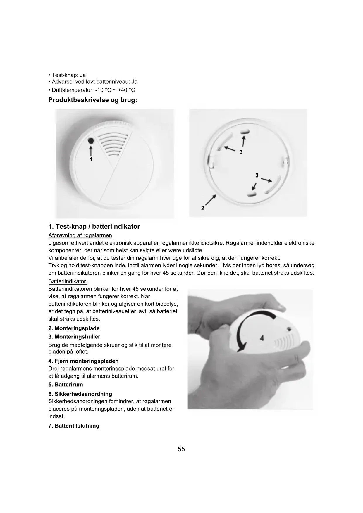 Når monteringspladen er installeret og røgalarmen er afprøvet efter indsætning af batteriet, anbringes