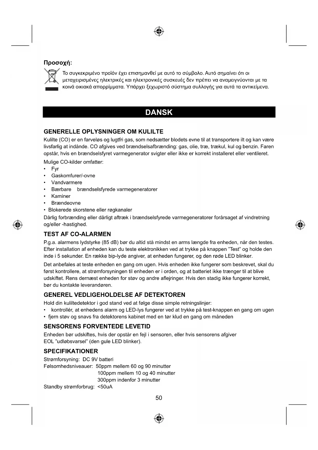 ANSVARSFRASKRIVELSE Denne detektor er designet til at registrere og advare om tilstedeværelse af kulilte fra ENHVER