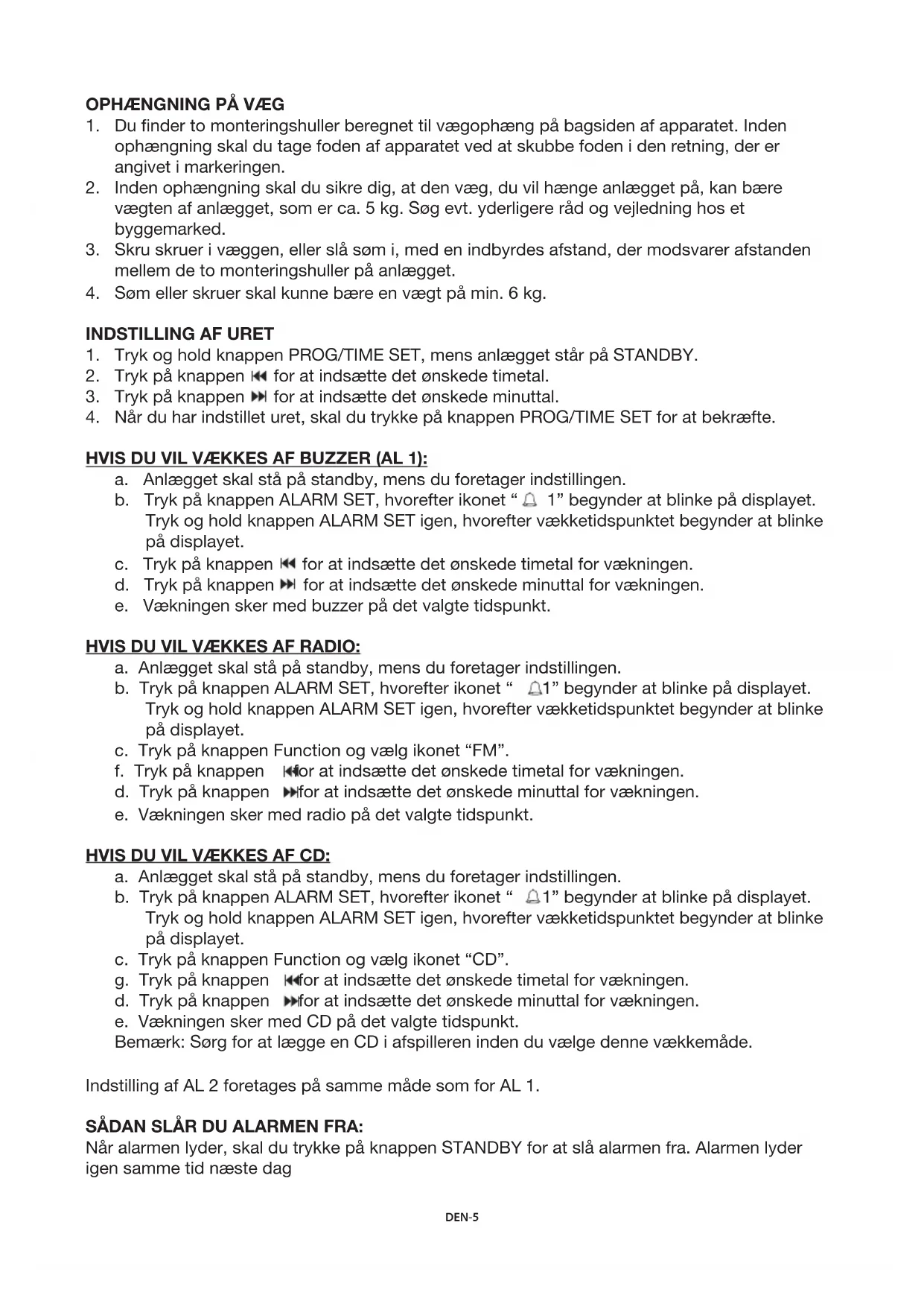 HVIS DU VIL VÆKKES AF BUZZER (AL 1): a. Anlægget skal stå på standby, mens du foretager indstillingen. b. Tryk på knappen ALARM SET, hvorefter ikonet “ 1” begynder at blinke på displayet. Tryk og hold knappen ALARM SET igen, hvorefter vækketidspunktet begynder at blinke på displayet. c. Tryk på knappen for at indsætte det ønskede timetal for vækningen. d. Tryk på knappen for at indsætte det ønskede minuttal for vækningen. e. Vækningen sker med buzzer på det valgte tidspunkt. HVIS DU VIL VÆKKES AF RADIO: a. Anlægget skal stå på standby, mens du foretager indstillingen. b. Tryk på knappen ALARM SET, hvorefter ikonet “ 1” begynder at blinke på displayet. Tryk og hold knappen ALARM SET igen, hvorefter vækketidspunktet begynder at blinke på displayet. c. Tryk på knappen Function og vælg ikonet “FM”. f. Tryk på knappen for at indsætte det ønskede timetal for vækningen. d. Tryk på knappen for at indsætte det ønskede minuttal for vækningen. e. Vækningen sker med radio på det valgte tidspunkt. HVIS DU VIL VÆKKES AF CD: a. Anlægget skal stå på standby, mens du foretager indstillingen. b. Tryk på knappen ALARM SET, hvorefter ikonet “ 1” begynder at blinke på displayet. Tryk og hold knappen ALARM SET igen, hvorefter vækketidspunktet begynder at blinke på displayet. c. Tryk på knappen Function og vælg ikonet “CD”. g. Tryk på knappen for at indsætte det ønskede timetal for vækningen. d. Tryk på knappen for at indsætte det ønskede minuttal for vækningen. e. Vækningen sker med CD på det valgte tidspunkt. Bemærk: Sørg for at lægge en CD i afspilleren inden du vælge denne vækkemåde. Indstilling af AL 2 foretages på samme måde som for AL 1. SÅDAN SLÅR DU ALARMEN FRA: Når alarmen lyder, skal du trykke på knappen STANDBY for at slå alarmen fra. Alarmen lyder igen samme tid næste dag