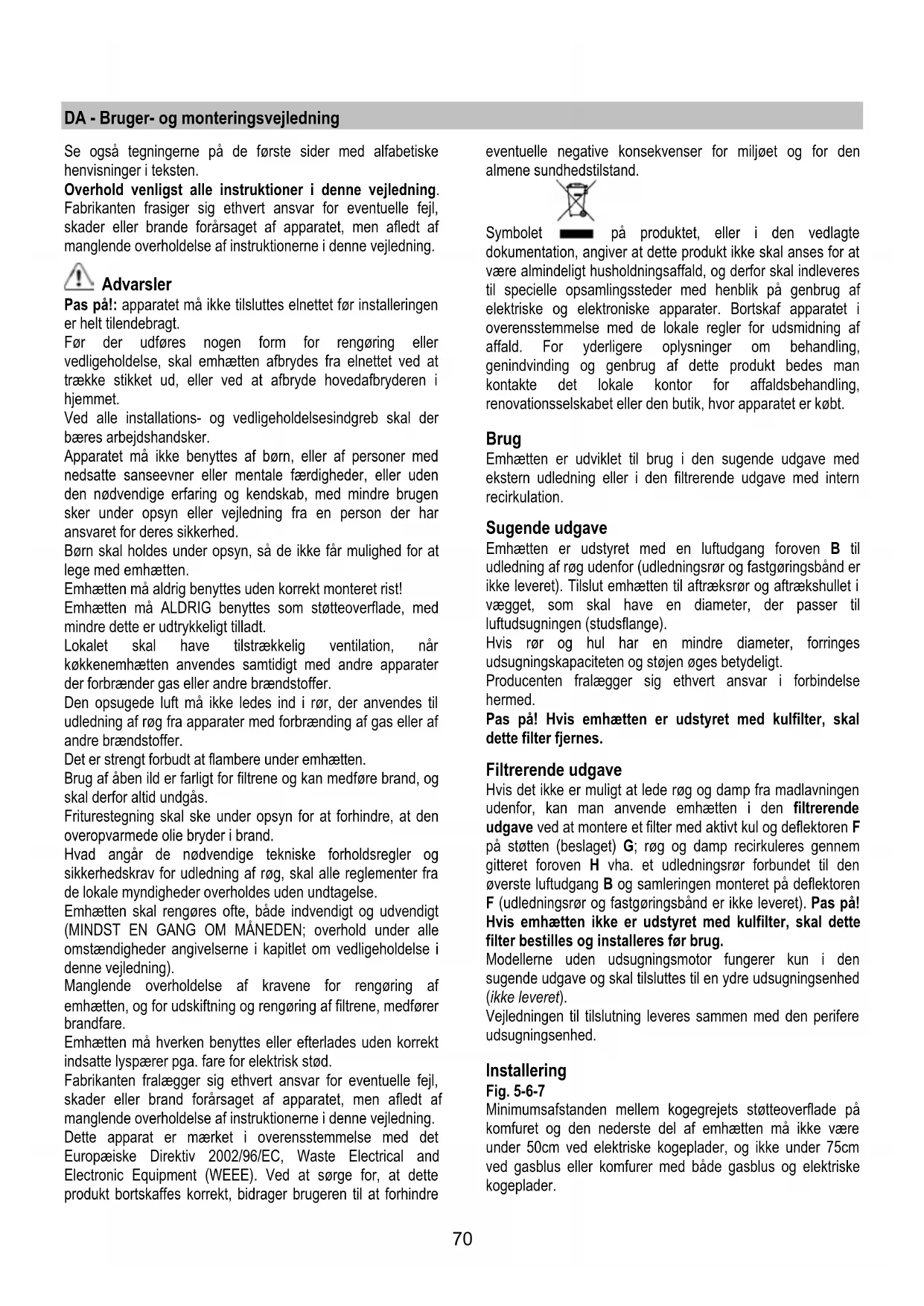 af apparatet og udskiftning af filtrene medfører brandfare. Der