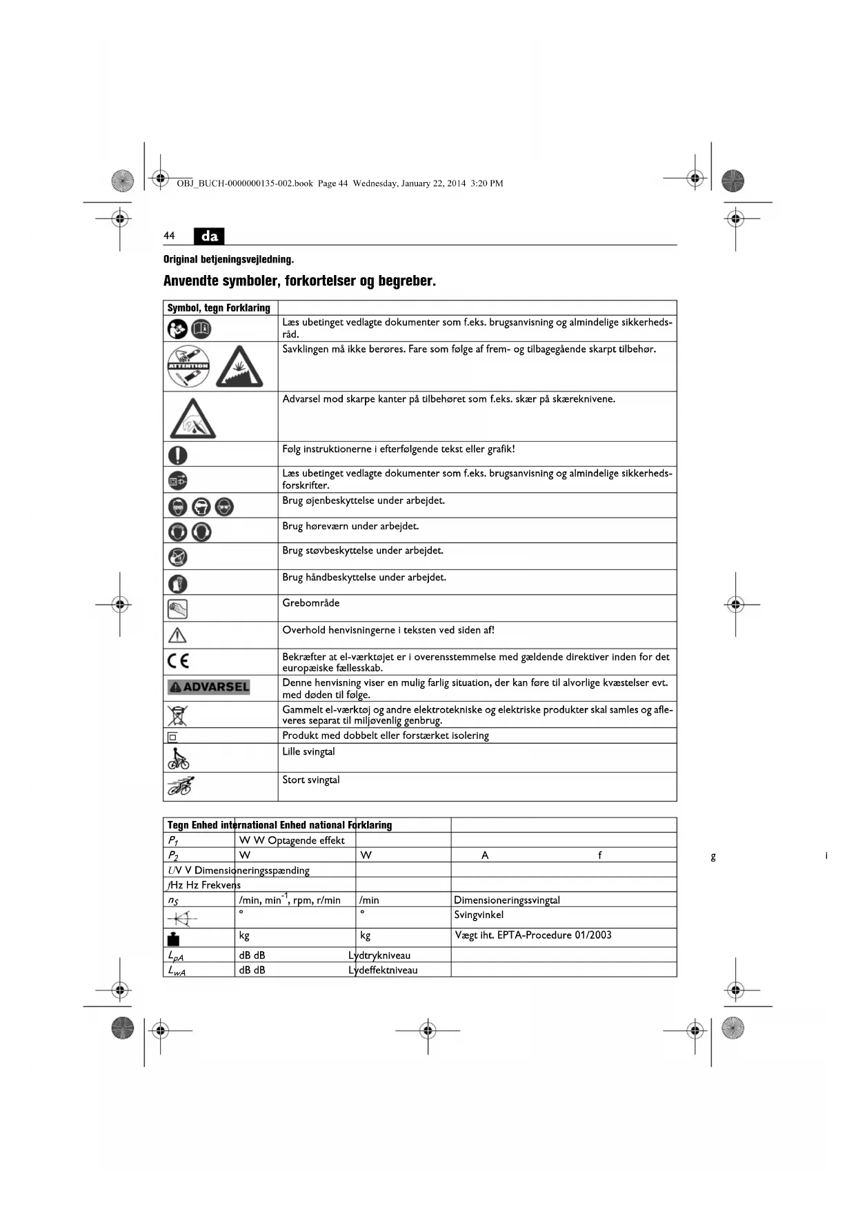 | m, s, kg, A, mm, V, W, Hz, N, °C, dB, min, m/s2 | m, s, kg, A, mm, V, W, Hz, N, °C, dB, min, m/s2 | Basisenheder og afledte enheder fra det internati- onale enchedsystem SI. | |