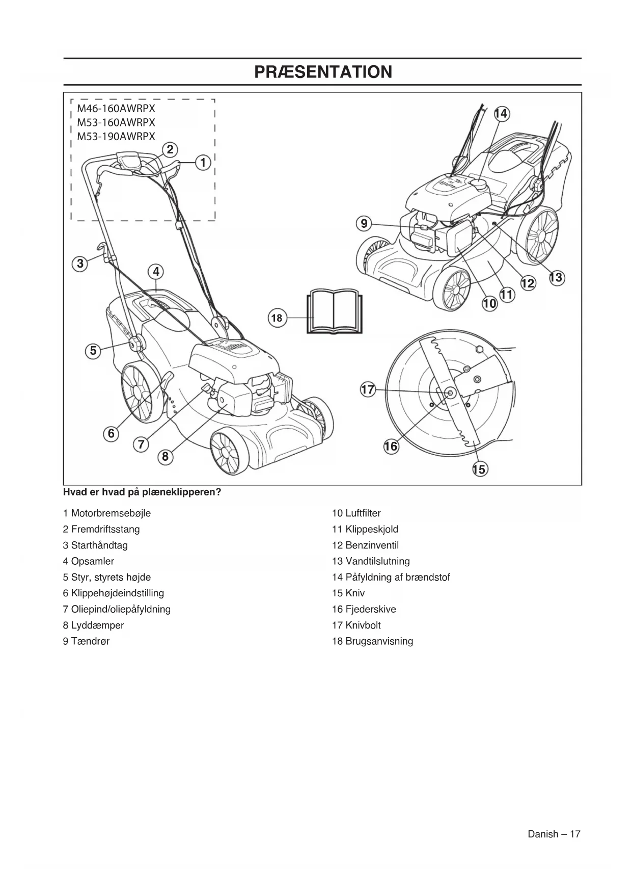 1 Motorbremsebøjle 2 Fremdriftsstang 3 Starthåndtag 4 Opsamler 5 Styr, styrets højde 6 Klippehøjdeindstilling 7 Oliepind/oliepåfyldning 8 Lyddæmper 9 Tændrør 10 Luftfilter 11 Klippeskjold 12 Benzinventil 13 Vandtilslutning 14 Påfyldning af brændstof 15 Kniv 16 Fjederskive 17 Knivbolt 18 BrugsanvisningMASKINENS SIKKERHEDSUDSTYR 18 – Danish Generelt I dette afsnit forklares mere om maskinens sikkerhedsdetaljer, hvilken funktion de har, samt hvordan kontrol og vedligeholdelse skal udføres for at sikre, at de fungerer. Klippeskjold