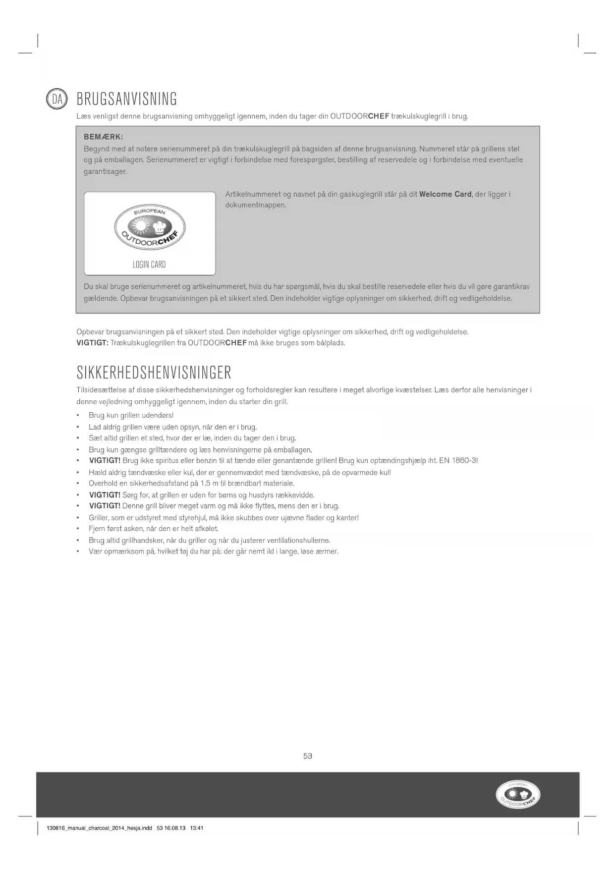 - Vær opmærksom på, hvilket tøj du har på: der går nemt ild i lange, løse ærmer. BEMÆRK: Begynd med at notere serienummeret på din trækulskuglegrill på bagsiden af denne brugsanvisning. Nummeret står på grillens stel og på emballagen. Serienummeret er vigtigt i forbindelse med forespørgsler, bestilling af reservedele og i forbindelse med eventuelle garantisager. Artikelnummeret og navnet på din gaskuglegrill står på dit Welcome Card, der ligger i dokumentmappen. Du skal bruge serienummeret og artikelnummeret, hvis du har spørgsmål, hvis du skal bestille reservedele eller hvis du vil gøre garantikrav gældende. Opbevar brugsanvisningen på et sikkert sted. Den indeholder vigtige oplysninger om sikkerhed, drift og vedligeholdelse. LOGIN CARD