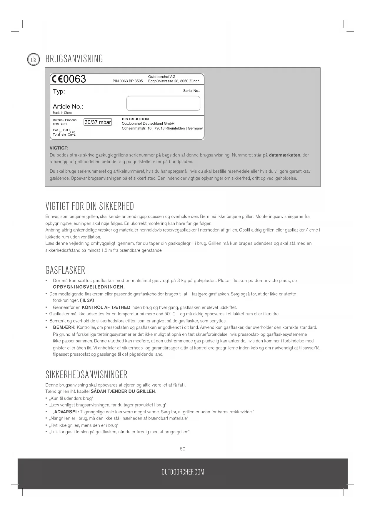 - „Når grillen er i brug, må den ikke stå i nærheden af brændbart materiale“• „Flyt ikke grillen, mens den er i brug“• „Luk for gastilførslen på gasflasken, når du er færdig med at bruge grillen“VIGTIGT:Du bedes straks skrive gaskuglegrillens serienummer på bagsiden af denne brugsanvisning. Nummeret står på datamærkaten, der afhængig af grillmodellen befinder sig på grillstellet eller på bundpladen. Du skal bruge serienummeret og artikelnummeret, hvis du har spørgsmål, hvis du skal bestille reservedele eller hvis du vil gøre garantikrav gældende. Opbevar brugsanvisningen på et sikkert sted. Den indeholder vigtige oplysninger om sikkerhed, drift og vedligeholdelse.