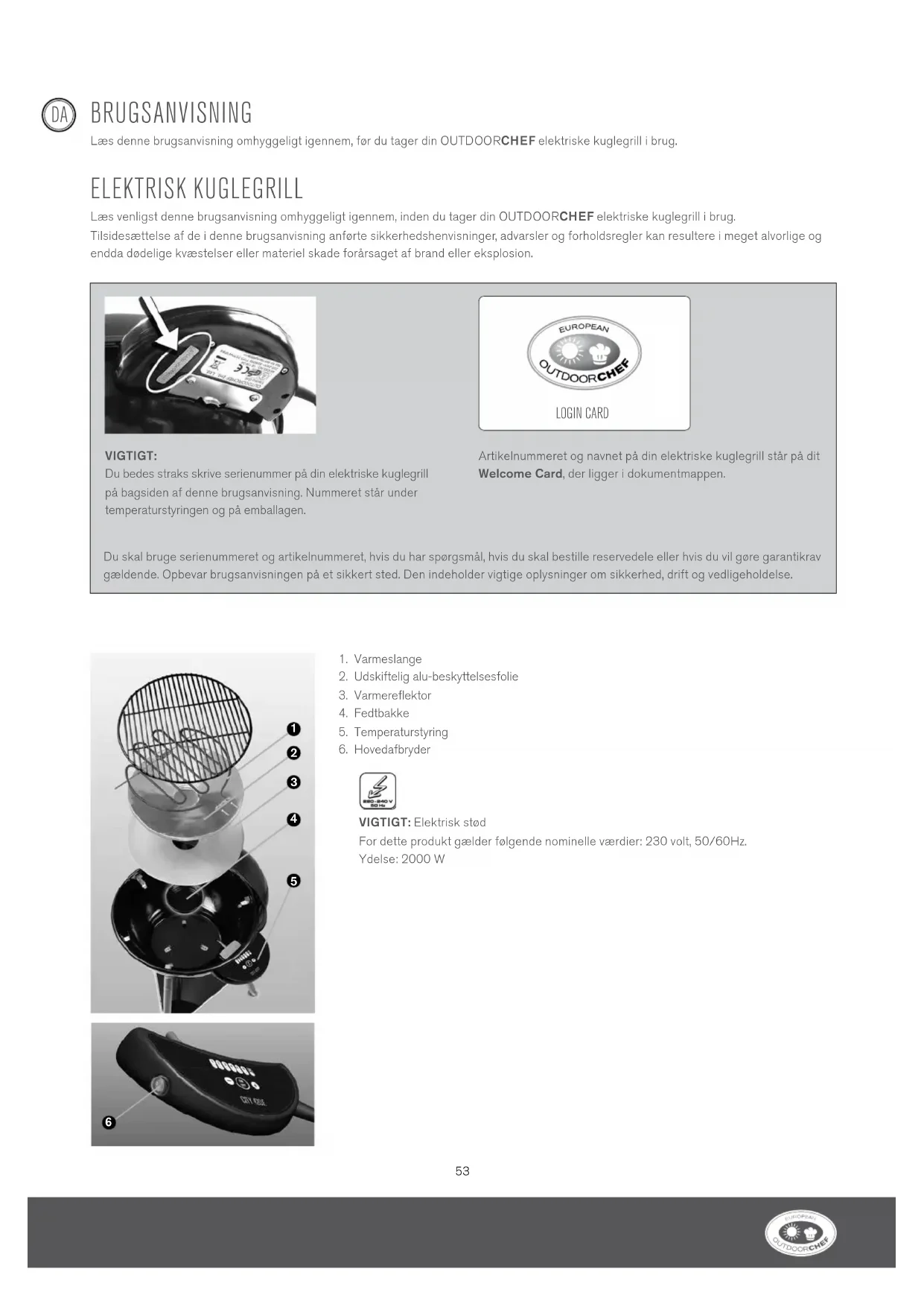 Du skal bruge serienummeret og artikelnummeret, hvis du har spørgsmål, hvis du skal bestille reservedele eller hvis du vil gøre garantikrav gældende. Opbevar brugsanvisningen på et sikkert sted. Den indeholder vigtige oplysninger om sikkerhed, drift og vedligeholdelse. LOGIN CARD VIGTIGT: Du bedes straks skrive serienummer på din elektriske kuglegrill på bagsiden af denne brugsanvisning. Nummeret står under temperaturstyringen og på emballagen. Artikelnummeret og navnet på din elektriske kuglegrill står på dit Welcome Card, der ligger i dokumentmappen.