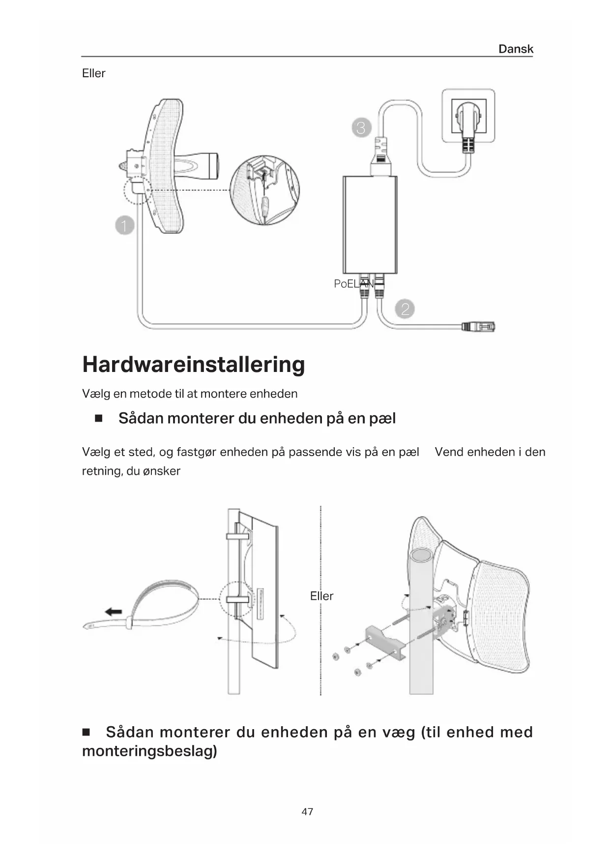 Hardwareinstallering Vælg en metode til at montere enheden ■ Sådan monterer du enheden på en pæl Vælg et sted, og fastgør enheden på passende vis på en pæl Vend enheden i den retning, du ønsker ■ Sådan monterer du enheden på en væg (til enhed med monteringsbeslag) EllerDansk