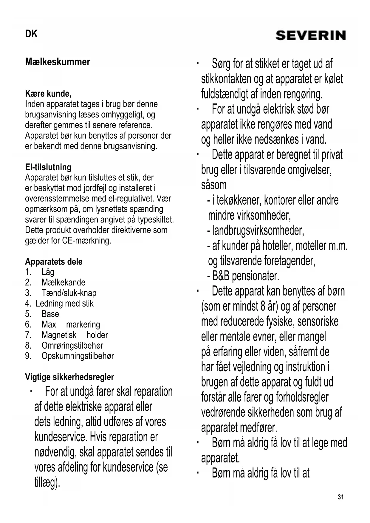 SM 3581 - Mælkeskummer SEVERIN - Notice d'utilisation et mode d'emploi gratuit