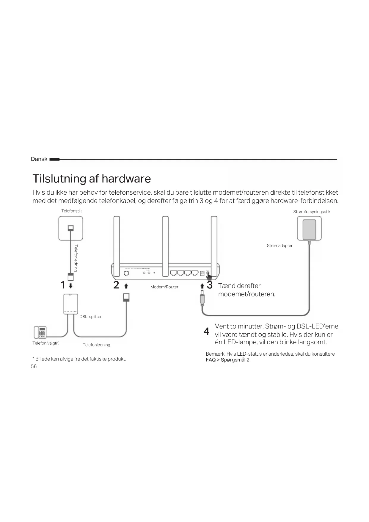1 2 DSL LAN1 LAN2 LAN3 LAN4/WAN POWER POWERON/OFFWPS RESETWiFiON/OFF* Billede kan afvige fra det faktiske produkt.Bemærk: Hvis LED-status er anderledes, skal du konsultere FAQ > Spørgsmål 2. Vent to minutter. Strøm- og DSL-LED’erne