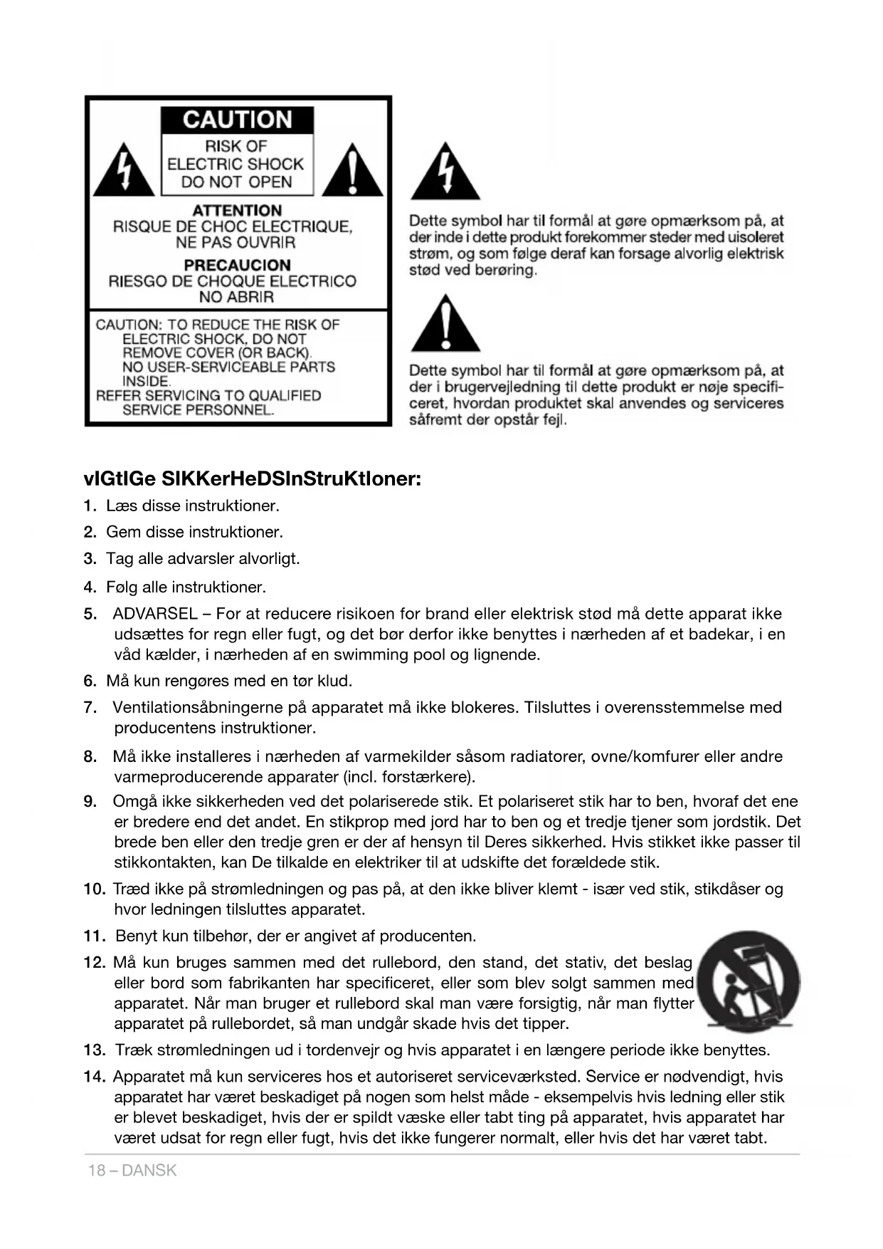 18. Dette apparat må kun benyttes med den strømkilde, der er angivet på bagpanelet. Hvis der