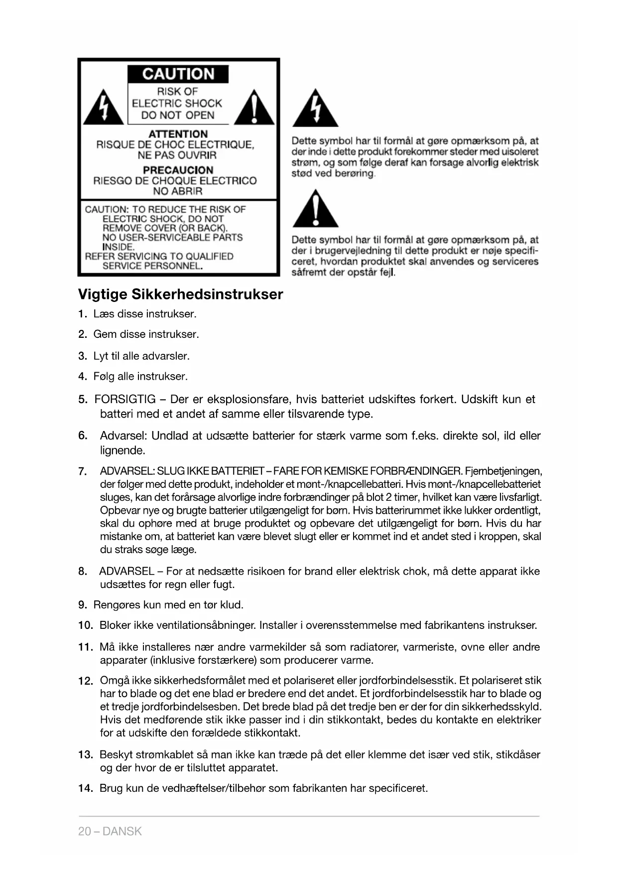 ADVARSEL: SLUG IKKE BATTERIET – FARE FOR KEMISKE FORBRÆNDINGER. Fjernbetjeningen, der følger med dette produkt, indeholder et mønt-/knapcellebatteri. Hvis mønt-/knapcellebatteriet sluges, kan det forårsage alvorlige indre forbrændinger på blot 2 timer, hvilket kan være livsfarligt. Opbevar nye og brugte batterier utilgængeligt for børn. Hvis batterirummet ikke lukker ordentligt, skal du ophøre med at bruge produktet og opbevare det utilgængeligt for børn. Hvis du har mistanke om, at batteriet kan være blevet slugt eller er kommet ind et andet sted i kroppen, skal du straks søge læge.