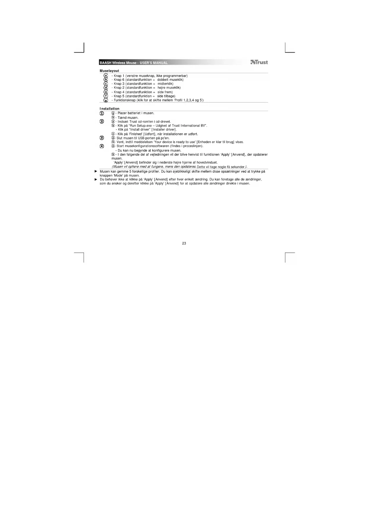 Download vejledningen til din Mus i PDF-format gratis! Find din vejledning Daash - TRUST og tag din elektroniske enhed tilbage i hånden. På denne side er alle dokumenter nødvendige for brugen af din enhed offentliggjort. Daash af mærket TRUST.