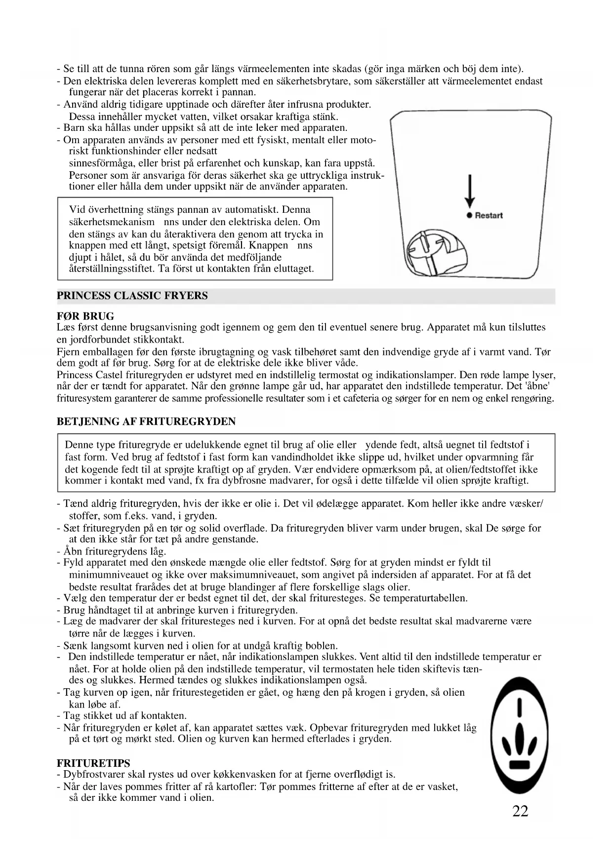 PRINCESS CLASSIC FRYERS FØR BRUG Læs først denne brugsanvisning godt igennem og gem den til eventuel senere brug. Apparatet må kun tilsluttes