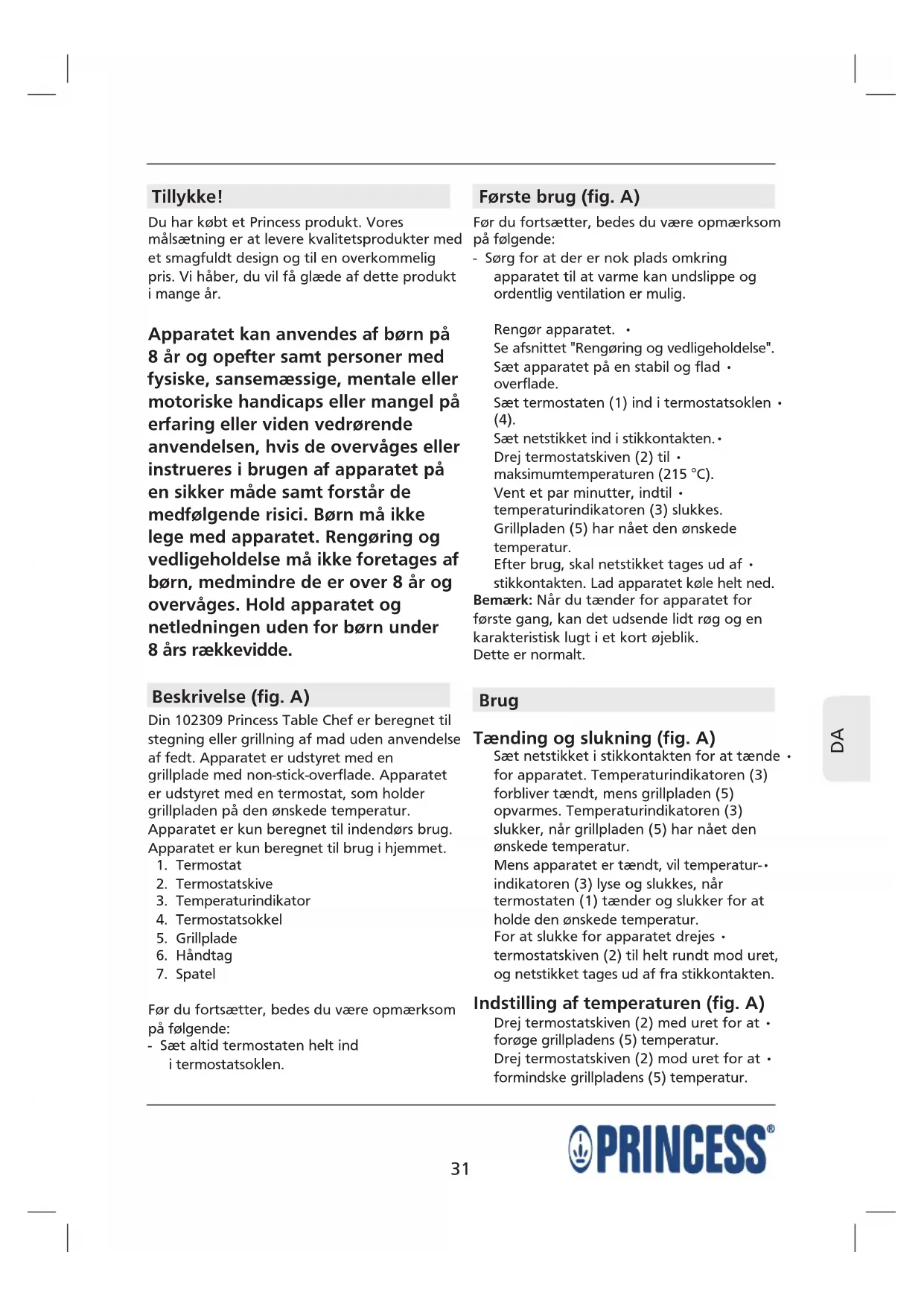 Tillykke! Du har købt et Princess produkt. Vores målsætning er at levere kvalitetsprodukter med et smagfuldt design og til en overkommelig pris. Vi håber, du vil få glæde af dette produkt i mange år. Apparatet kan anvendes af børn på 8 år og opefter samt personer med fysiske, sansemæssige, mentale eller motoriske handicaps eller mangel på erfaring eller viden vedrørende anvendelsen, hvis de overvåges eller instrueres i brugen af apparatet på en sikker måde samt forstår de medfølgende risici. Børn må ikke lege med apparatet. Rengøring og vedligeholdelse må ikke foretages af børn, medmindre de er over 8 år og overvåges. Hold apparatet og netledningen uden for børn under 8 års rækkevidde. Beskrivelse (fig. A) Din 102309 Princess Table Chef er beregnet til stegning eller grillning af mad uden anvendelse af fedt. Apparatet er udstyret med en grillplade med non-stick-overflade. Apparatet er udstyret med en termostat, som holder grillpladen på den ønskede temperatur. Apparatet er kun beregnet til indendørs brug. Apparatet er kun beregnet til brug i hjemmet.